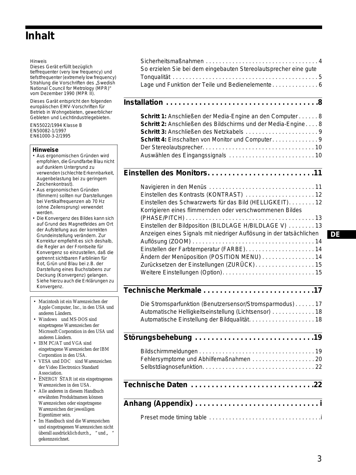 Affichage d’un signal de faible résolution à la résolution en cours (ZOOM). . . . . . . . . . . . . . . . . . . . . . . . . . . . . . . . . . . . . . . . . . . . . . 14 Réglage de la température des couleurs (COULEUR) . . . . . . . . . . 14 Changement de la position du menu (POSITION MENU) . . . . . . . 14 Réinitialisation des réglages (RESTAUR) . . . . . . . . . . . . . . . . . . . 15 • IBM PC/AT et VGA sont des marques commerciales déposées d’IBM Corporation of the U.S.A. • VESA et DDC sont des marques commerciales de Video Electronics Standard Association. • ENERGY STAR est une marque déposée aux Etats-Unis. • Tous les autres noms de produit mentionnés dans le présent mode d'emploi peuvent être des marques commerciales ou des marques commerciales déposées de leurs entreprises respectives. • De plus, les symboles “” et “” ne sont pas systématiquement mentionnés dans ce mode d’emploi.