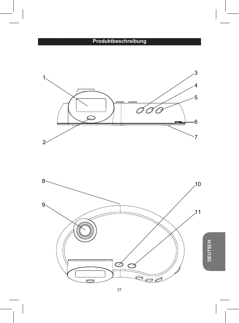 7. Compartiment à piles (sous l’appareil) 8. Antenne radio 9. Projecteur 10. SCAN: Rechercher des stations radio. 11. RESET: Réinitialiser la fréquence radio pour lancer une nouvelle recherche de stations. 3. Réglez les minutes à l’aide de la touche ADJUST, puis appuyez sur SET pour passer au réglage suivant. Les réglages s’effectuent dans l’ordre suivant: Minutes Heures Date CONSEIL: Maintenez enfoncée la touche ADJUST pour passer plus rapidement d’un réglage à l’autre. Date et heure d’alarme: En mode horloge, maintenez enfoncée la touche ADJUST pour regarder la date et maintenez enfoncée la touche SET pour vérifier l’heure de l’alarme. ALARME 1. Pour régler l’alarme, appuyez 2 fois sur MODE. 2. Réglez l’heure à l’aide de la touche ADJUST, puis appuyez sur SET pour passer au réglage suivant. 3. Réglez les minutes à l’aide de la touche ADJUST, puis appuyez sur MODE pour confirmer. 4. Lorsque l’alarme retentit, appuyez sur ADJUST pour la repousser de 5 minutes, ou sur SET pour l’éteindre complètement. L’alarme retentira à nouveau le lendemain à la même heure. Activer ou désactiver l’alarme: En mode horloge, appuyez simultanément sur SET et sur ADJUST. Le symbole apparaît à l’écran, indiquant que l’alarme est activée.