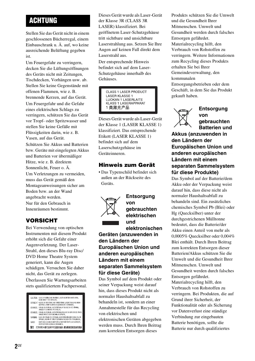 VORSICHT Bei Verwendung von optischen Instrumenten mit diesem Produkt erhöht sich die Gefahr einer Augenverletzung. Der LaserStrahl, den dieses Blu-ray Disc/ DVD Home Theatre System generiert, kann die Augen schädigen. Versuchen Sie daher nicht, das Gerät zu zerlegen. Überlassen Sie Wartungsarbeiten stets qualifiziertem Fachpersonal.