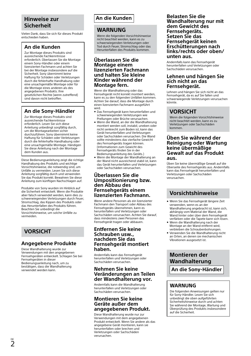 SU-WL450 - TV-Wandhalterung SONY - Kostenlose Bedienungsanleitung