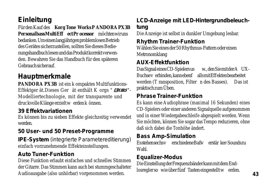 Für den Kauf des Korg Tone Works P ANDORA PX3B PersonalbassMultiEff ectPr processor möchten wiruns bedanken. Umeinen langjährigen problemlosen Betrieb des Gerätes sicherzustellen, sollen den Sie these Bedienungshandbuch setzen und das Produkt korrekt verwenden. Bewahren Sie das Handbuch für den späteren Gebrauchsicherauf.