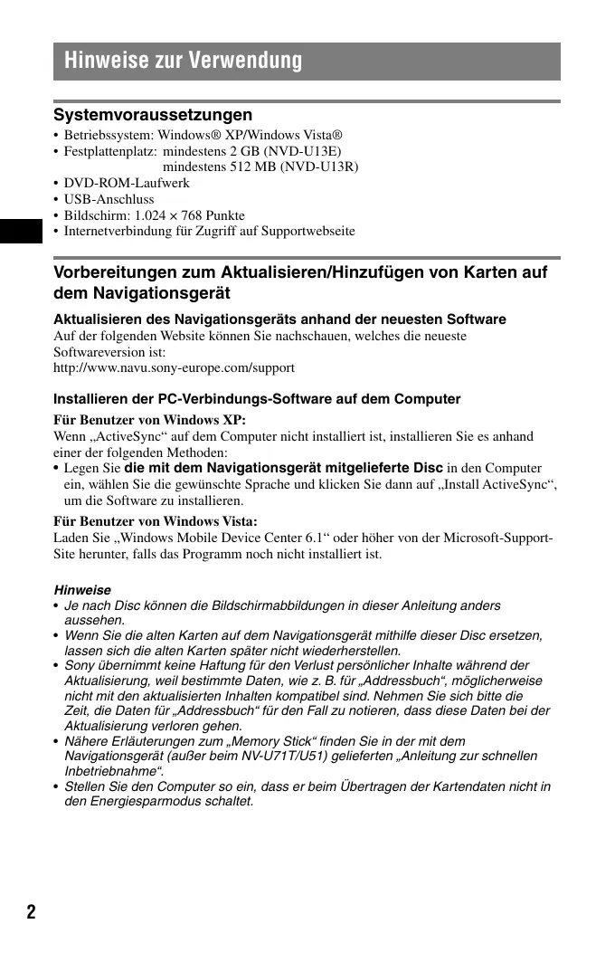 - Internetverbindung für Zugriff auf Supportwebseite Vorbereitungen zum Aktualisieren/Hinzufügen von Karten auf dem Navigationsgerät Aktualisieren des Navigationsgeräts anhand der neuesten Software Auf der folgenden Website können Sie nachschauen, welches die neueste Softwareversion ist: http://www.navu.sony-europe.com/support Installieren der PC-Verbindungs-Software auf dem Computer Für Benutzer von Windows XP: Wenn „ActiveSync“ auf dem Computer nicht installiert ist, installieren Sie es anhand einer der folgenden Methoden: