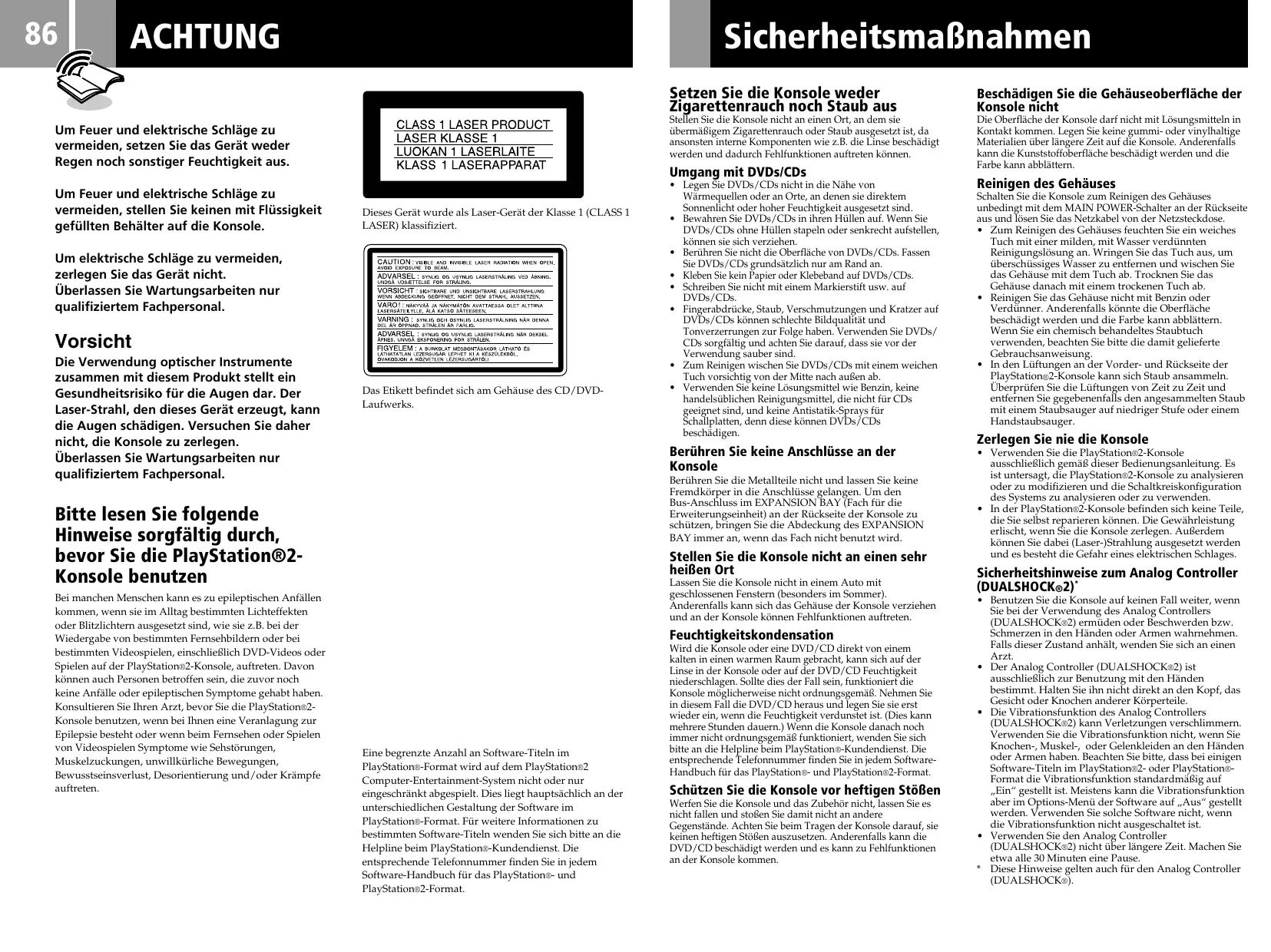 - In der PlayStation®2-Konsole befinden sich keine Teile, die Sie selbst reparieren können. Die Gewährleistung erlischt, wenn Sie die Konsole zerlegen. Außerdem können Sie dabei (Laser-)Strahlung ausgesetzt werden und es besteht die Gefahr eines elektrischen Schlages. Sicherheitshinweise zum Analog Controller (DUALSHOCK®2)*