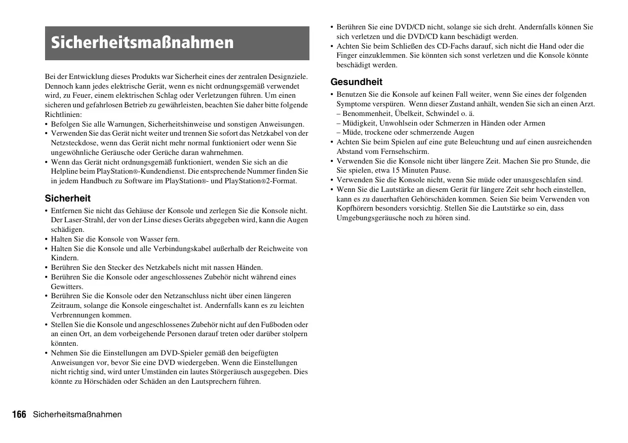- Wenn das Gerät nicht ordnungsgemäß funktioniert, wenden Sie sich an die Helpline beim PlayStation®-Kundendienst. Die entsprechende Nummer finden Sie in jedem Handbuch zu Software im PlayStation®- und PlayStation®2-Format. Sicherheit