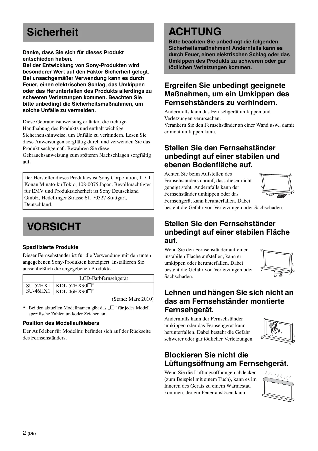 8 (ES) Sicherheit Danke, dass Sie sich für dieses Produkt entschieden haben. Bei der Entwicklung von Sony-Produkten wird besonderer Wert auf den Faktor Sicherheit gelegt. Bei unsachgemäßer Verwendung kann es durch Feuer, einen elektrischen Schlag, das Umkippen oder das Herunterfallen des Produkts allerdings zu schweren Verletzungen kommen. Beachten Sie bitte unbedingt die Sicherheitsmaßnahmen, um solche Unfälle zu vermeiden. Diese Gebrauchsanweisung erläutert die richtige Handhabung des Produkts und enthält wichtige Sicherheitshinweise, um Unfälle zu verhindern. Lesen Sie diese Anweisungen sorgfältig durch und verwenden Sie das Produkt sachgemäß. Bewahren Sie diese Gebrauchsanweisung zum späteren Nachschlagen sorgfältig auf. Der Hersteller dieses Produktes ist Sony Corporation, 1-7-1 Konan Minato-ku Tokio, 108-0075 Japan. Bevollmächtigter für EMV und Produktsicherheit ist Sony Deutschland GmbH, Hedelfinger Strasse 61, 70327 Stuttgart, Deutschland. VORSICHT Spezifizierte Produkte Dieser Fernsehständer ist für die Verwendung mit den unten angegebenen Sony-Produkten konzipiert. Installieren Sie ausschließlich die angegebenen Produkte. SU-52HX1 SU-46HX1 LCD-Farbfernsehgerät KDL-52HX90s* KDL-46HX90s* (Stand: März 2010)