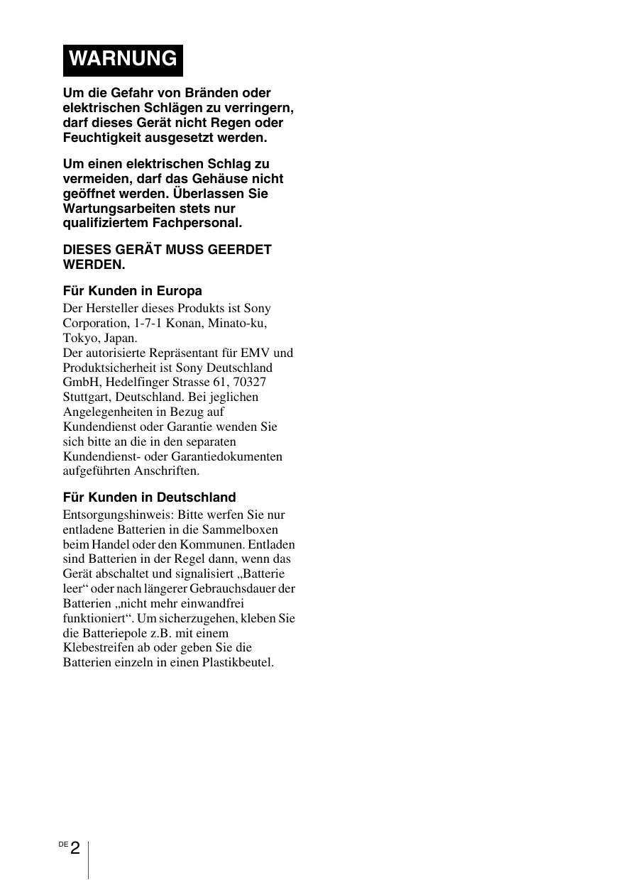 LA TERRE. Pour les clients au Canada AVERTISSEMENT L’utilisation de l’appareil avec une tension autre que 120 V peut nécessiter l’utilisation d’un autre cordon d’alimentation ou d’une autre prise ou les deux à la fois. Pour réduire le risque d’incendie et d’électrocution, confiez toute réparation à un personnel qualifié. Pour les clients au Canada Cet appareil numérique de la classe B est conforme à la norme NMB-003 du Canada. Pour les clients en Europe Le fabricant de ce produit est Sony Corporation, 1-7-1 Konan, Minato-ku, Tokyo, Japon. Le représentant autorisé pour EMC et la sécurité des produits est Sony Deutschland GmbH, Hedelfinger Strasse 61, 70327 Stuttgart, Allemagne. Pour toute question concernant le service ou la garantie, veuillez consulter les adresses indiquées dans les documents de service ou de garantie séparés.