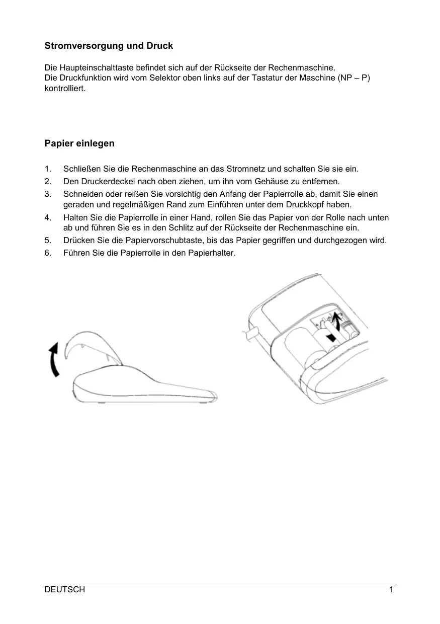 Schließen Sie die Rechenmaschine an das Stromnetz und schalten Sie sie ein. Den Druckerdeckel nach oben ziehen, um ihn vom Gehäuse zu entfernen. Schneiden oder reißen Sie vorsichtig den Anfang der Papierrolle ab, damit Sie einen geraden und regelmäßigen Rand zum Einführen unter dem Druckkopf haben.