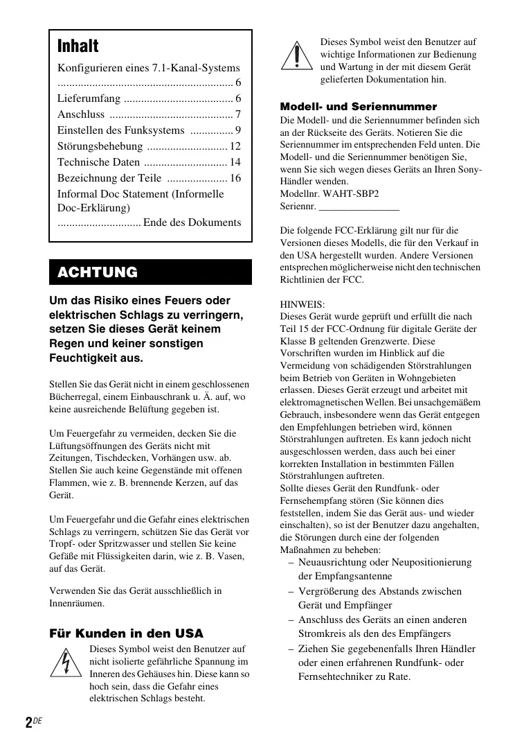 Inhalt Konfigurieren eines 7.1-Kanal-Systems Lieferumfang ...................................... 6 Anschluss ........................................... 7 Einstellen des Funksystems ............... 9 Störungsbehebung ............................ 12 Technische Daten ............................. 14 Bezeichnung der Teile ..................... 16 Informal Doc Statement (Informelle Doc-Erklärung) ............................. Ende des Dokuments ACHTUNG Um das Risiko eines Feuers oder elektrischen Schlags zu verringern, setzen Sie dieses Gerät keinem Regen und keiner sonstigen Feuchtigkeit aus. Stellen Sie das Gerät nicht in einem geschlossenen Bücherregal, einem Einbauschrank u. Ä. auf, wo keine ausreichende Belüftung gegeben ist. Um Feuergefahr zu vermeiden, decken Sie die Lüftungsöffnungen des Geräts nicht mit Zeitungen, Tischdecken, Vorhängen usw. ab. Stellen Sie auch keine Gegenstände mit offenen Flammen, wie z. B. brennende Kerzen, auf das Gerät. Um Feuergefahr und die Gefahr eines elektrischen Schlags zu verringern, schützen Sie das Gerät vor Tropf- oder Spritzwasser und stellen Sie keine Gefäße mit Flüssigkeiten darin, wie z. B. Vasen, auf das Gerät. Verwenden Sie das Gerät ausschließlich in Innenräumen. Für Kunden in den USA Dieses Symbol weist den Benutzer auf nicht isolierte gefährliche Spannung im Inneren des Gehäuses hin. Diese kann so hoch sein, dass die Gefahr eines elektrischen Schlags besteht. 2DE Dieses Symbol weist den Benutzer auf wichtige Informationen zur Bedienung und Wartung in der mit diesem Gerät gelieferten Dokumentation hin. Modell- und Seriennummer Die Modell- und die Seriennummer befinden sich an der Rückseite des Geräts. Notieren Sie die Seriennummer im entsprechenden Feld unten. Die Modell- und die Seriennummer benötigen Sie, wenn Sie sich wegen dieses Geräts an Ihren SonyHändler wenden. Modellnr. WAHT-SBP2 Seriennr. ________________ Die folgende FCC-Erklärung gilt nur für die Versionen dieses Modells, die für den Verkauf in den USA hergestellt wurden. Andere Versionen entsprechen möglicherweise nicht den technischen Richtlinien der FCC. HINWEIS: Dieses Gerät wurde geprüft und erfüllt die nach Teil 15 der FCC-Ordnung für digitale Geräte der Klasse B geltenden Grenzwerte. Diese Vorschriften wurden im Hinblick auf die Vermeidung von schädigenden Störstrahlungen beim Betrieb von Geräten in Wohngebieten erlassen. Dieses Gerät erzeugt und arbeitet mit elektromagnetischen Wellen. Bei unsachgemäßem Gebrauch, insbesondere wenn das Gerät entgegen den Empfehlungen betrieben wird, können Störstrahlungen auftreten. Es kann jedoch nicht ausgeschlossen werden, dass auch bei einer korrekten Installation in bestimmten Fällen Störstrahlungen auftreten. Sollte dieses Gerät den Rundfunk- oder Fernsehempfang stören (Sie können dies feststellen, indem Sie das Gerät aus- und wieder einschalten), so ist der Benutzer dazu angehalten, die Störungen durch eine der folgenden Maßnahmen zu beheben: – Neuausrichtung oder Neupositionierung der Empfangsantenne – Vergrößerung des Abstands zwischen Gerät und Empfänger – Anschluss des Geräts an einen anderen Stromkreis als den des Empfängers – Ziehen Sie gegebenenfalls Ihren Händler oder einen erfahrenen Rundfunk- oder Fernsehtechniker zu Rate. VORSICHT Alle Änderungen am Gerät, die in dieser Anleitung nicht ausdrücklich als zulässig beschrieben sind, können dazu führen, dass die Genehmigung zur Inbetriebnahme dieses Geräts erlischt. Wichtige Sicherheitshinweise