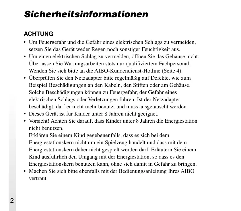 - Um einen elektrischen Schlag zu vermeiden, öffnen Sie das Gehäuse nicht. Überlassen Sie Wartungsarbeiten stets nur qualifiziertem Fachpersonal. Wenden Sie sich bitte an die AIBO-Kundendienst-Hotline (Seite 4).