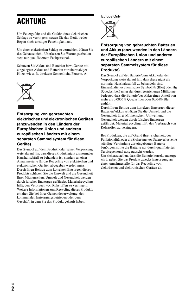 Europe Only Entsorgung von gebrauchten Batterien und Akkus (anzuwenden in den Ländern der Europäischen Union und anderen europäischen Ländern mit einem separaten Sammelsystem für diese Produkte) Das Symbol auf der Batterie/dem Akku oder der Verpackung weist darauf hin, dass diese nicht als normaler Haushaltsabfall zu behandeln sind. Ein zusätzliches chemisches Symbol Pb (Blei) oder Hg (Quecksilber) unter der durchgestrichenen Mülltonne bedeutet, dass die Batterie/der Akku einen Anteil von mehr als 0,0005% Quecksilber oder 0,004% Blei enthält. Durch Ihren Beitrag zum korrekten Entsorgen dieser Batterien/Akkus schützen Sie die Umwelt und die Gesundheit Ihrer Mitmenschen. Umwelt und Gesundheit werden durch falsches Entsorgen gefährdet. Materialrecycling hilft, den Verbrauch von Rohstoffen zu verringern. Bei Produkten, die auf Grund ihrer Sicherheit, der Funktionalität oder als Sicherung vor Datenverlust eine ständige Verbindung zur eingebauten Batterie benötigen, sollte die Batterie nur durch qualifiziertes Servicepersonal ausgetauscht werden. Um sicherzustellen, dass die Batterie korrekt entsorgt wird, geben Sie das Produkt zwecks Entsorgung an einer Annahmestelle für das Recycling von elektrischen und elektronischen Geräten ab. Für alle anderen Batterien entnehmen Sie die Batterie bitte entsprechend dem Kapitel über die sichere Entfernung der Batterie. Geben Sie die Batterie an einer Annahmestelle für das Recycling von Batterien/ Akkus ab. Weitere Informationen über das Recycling dieses Produkts oder der Batterie erhalten Sie von Ihrer Gemeinde, den kommunalen Entsorgungsbetrieben oder dem Geschäft, in dem Sie das Produkt gekauft haben. Der Hersteller dieses Produktes ist Sony Corporation, 1-7-1 Konan Minato-ku Tokio, 108-0075 Japan. Bevollmächtigter für EMV und Produktsicherheit ist Sony Deutschland GmbH, Hedelfinger Strasse 61, 70327 Stuttgart, Deutschland. Für Kundendienst- oder Garantieangelegenheiten wenden Sie sich bitte an die in Kundendienst- oder Garantiedokumenten genannten Adressen. Sicherheitsmaßnahmen
