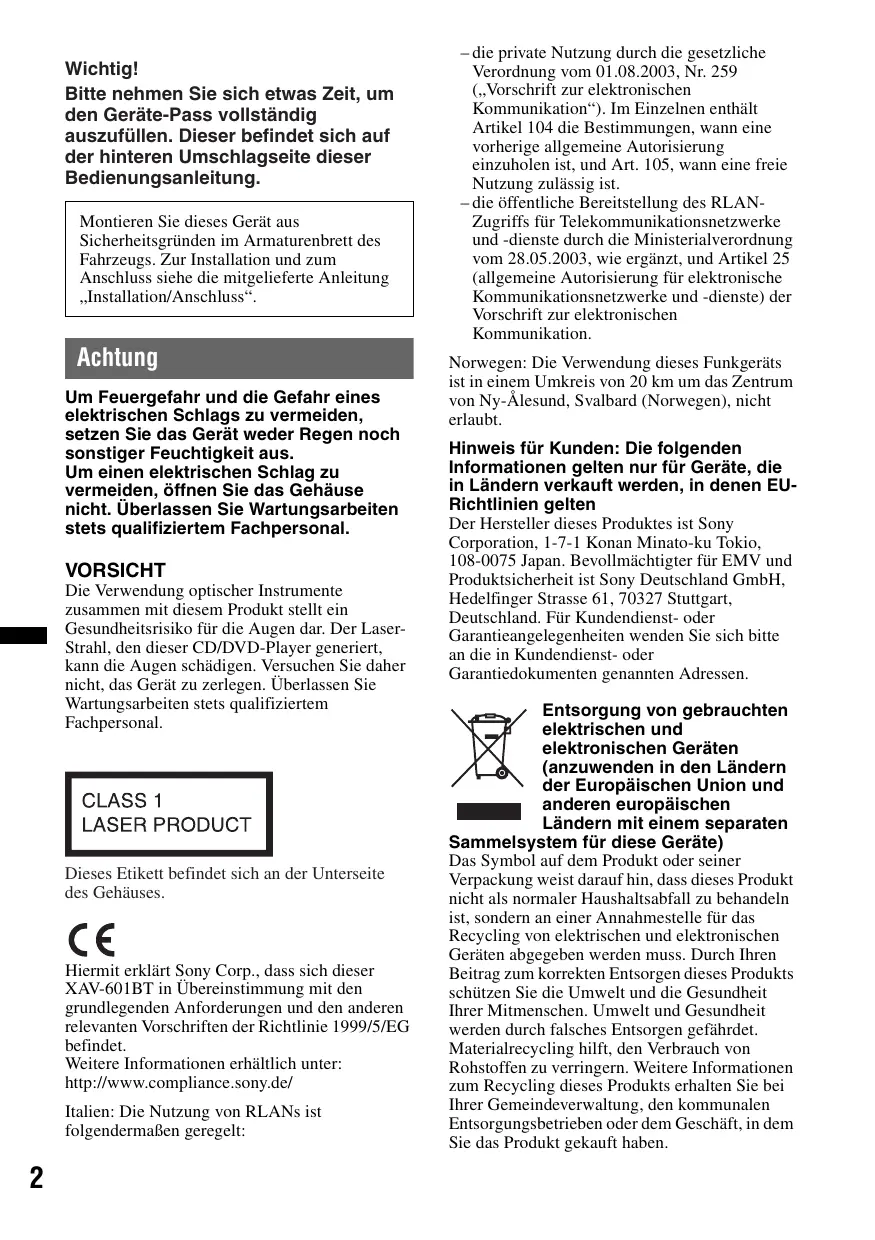 XAV-601BT est conforme aux exigences essentielles et aux autres dispositions pertinentes de la Directive 1999/5/CE. Pour toute information complémentaire, veuillez consultez l’URL suivante : http://www.compliance.sony.de/ Italie : L’utilisation du réseau RLAN est régie : – en ce qui concerne l’usage privé, par le décret-loi n° 259 du 1.8.2003 (« Code des communications électroniques »). Notamment, l’Article 104 définit les circonstances pour lesquelles l’obtention d’une autorisation générale préalable est requise et l’Article 105 définit les circonstances pour lesquelles une utilisation libre est permise ;
