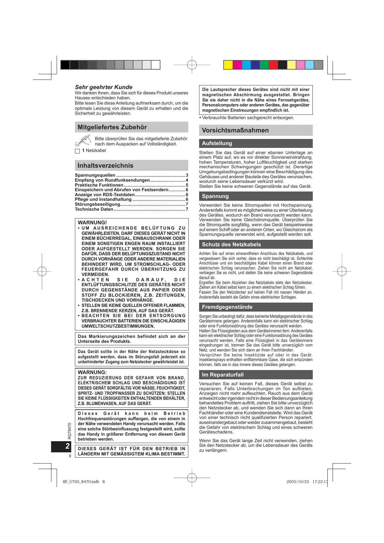 Dieses Gerät kann beim Betrieb Hochfrequenzstörungen auffangen, die von einem in der Nähe verwendeten Handy verursacht werden. Falls eine solche Störbeeinflussung festgestellt wird, sollte das Handy in größerer Entfernung von diesem Gerät betrieben werden. DIESES GERÄT IST FÜR DEN BETRIEB IN LÄNDERN MIT GEMÄSSIGTEM KLIMA BESTIMMT. RF̲U700̲8470.indb 8 Die Lautsprecher dieses Gerätes sind nicht mit einer magnetischen Abschirmung ausgestattet. Bringen Sie sie daher nicht in die Nähe eines Fernsehgerätes, Personalcomputers oder anderen Gerätes, das gegenüber magnetischen Einstreuungen empfindlich ist.