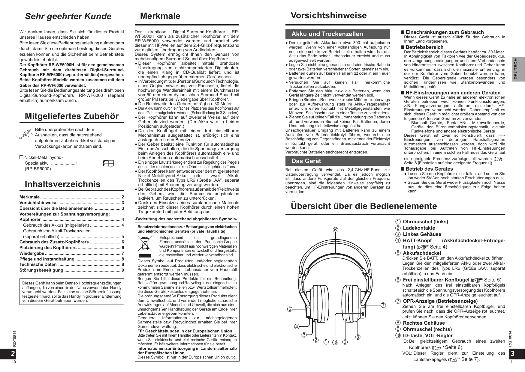 Drücken Sie BATT, um den Akkufachdeckel zu öffnen. Legen Sie den mitgelieferten Akku oder zwei AlkaliTrockenzellen des Typs LR6 (Größe „AA“, separat erhältlich) in das Fach ein. f Frei einstellbarer Kopfbügel ( Seite 5) Nach Anlegen des frei einstellbaren Kopfbügels schaltet sich die Spannungsversorgung des Kopfhörers automatisch ein, und die OPR-Anzeige leuchtet auf. g OPR-Anzeige (Betriebsanzeige) Ziehen Sie am frei einstellbaren Kopfbügel, und prüfen Sie nach, dass die OPR-Anzeige rot leuchtet. Jetzt können Sie den Kopfhörer verwenden. h Rechtes Gehäuse i Ohrmuschel (rechts) j ID-Taste, VOL-Regler RQT8814 Sehr geehrter Kunde ID: Bei gleichzeitigem Gebrauch eines zweiten Kopfhörers ( Seite 6). VOL: Dieser Regler dient zur Einstellung des Lautstärkepegels ( Seite 7).