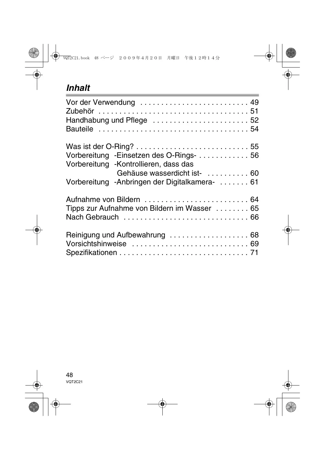 Was ist der O-Ring? . . . . . . . . . . . . . . . . . . . . . . . . . . . Vorbereitung -Einsetzen des O-Rings- . . . . . . . . . . . . Vorbereitung -Kontrollieren, dass das Gehäuse wasserdicht ist- . . . . . . . . . . Vorbereitung -Anbringen der Digitalkamera- . . . . . . .