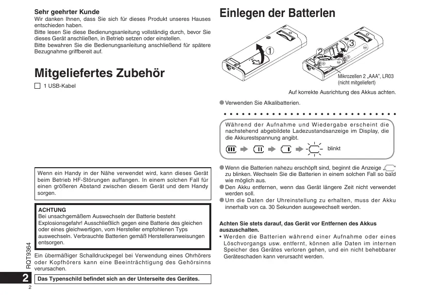 - Verwenden Sie Alkalibatterien. Wä h r e n d d e r Au f n a h m e u n d W i e d e r g a b e e r s c h e i n t d i e nachstehend abgebildete Ladezustandsanzeige im Display, die die Akkurestspannung angibt. blinkt RQT9364 Wenn ein Handy in der Nähe verwendet wird, kann dieses Gerät beim Betrieb HF-Störungen auffangen. In einem solchen Fall für einen größeren Abstand zwischen diesem Gerät und dem Handy sorgen.