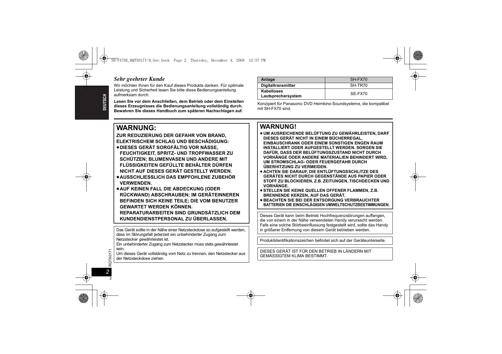 Das Gerät sollte in der Nähe einer Netzsteckdose so aufgestellt werden, dass im Störungsfall jederzeit ein unbehinderter Zugang zum Netzstecker gewährleistet ist. Ein unbehinderter Zugang zum Netzstecker muss stets gewährleistet sein. Um dieses Gerät vollständig vom Netz zu trennen, den Netzstecker aus der Netzsteckdose ziehen. 12:37 PM Anlage Digitaltransmitter Kabelloses Lautsprechersystem SH-FX70 SH-TR70 SE-FX70 Konzipiert für Panasonic DVD Heimkino-Soundsysteme, die kompatibel mit SH-FX70 sind. WARNUNG! ≥ UM AUSREICHENDE BELÜFTUNG ZU GEWÄHRLEISTEN, DARF DIESES GERÄT NICHT IN EINEM BÜCHERREGAL,
