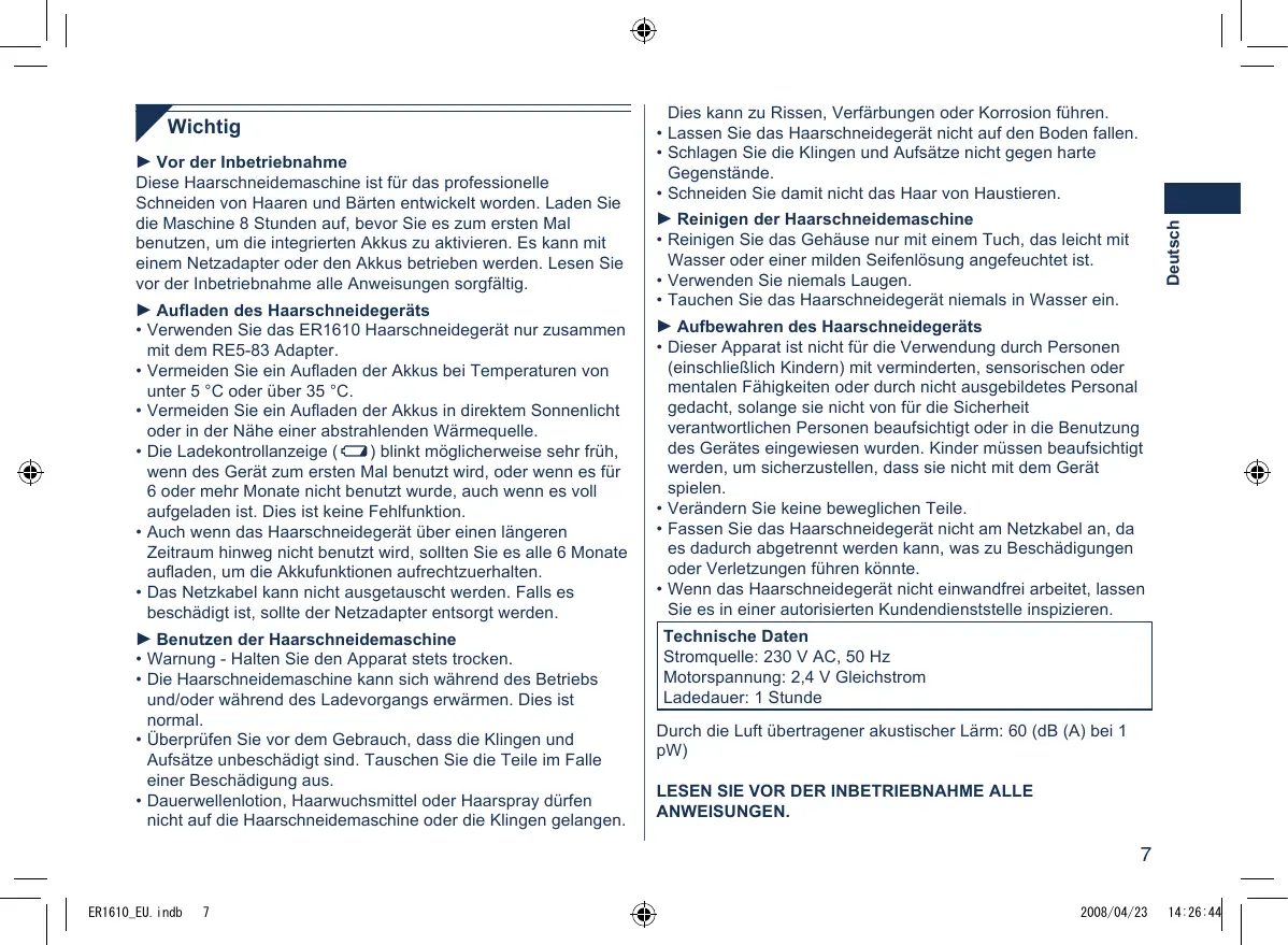 BEDIENUNGSANLEITUNG ER1610 PANASONIC