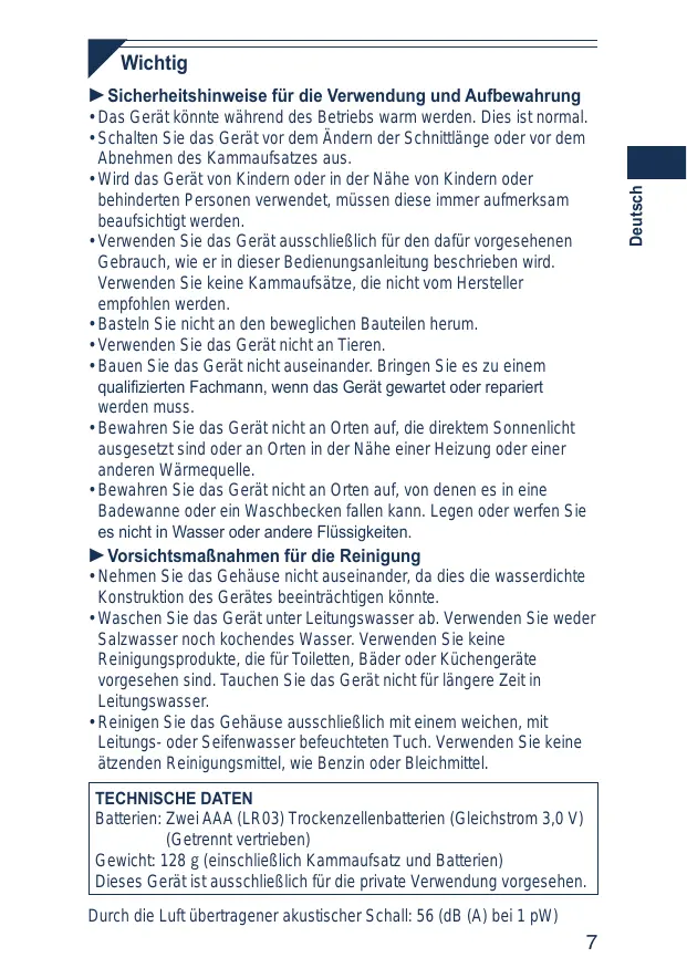 - Reinigen Sie das Gehäuse ausschließlich mit einem weichen, mit Leitungs- oder Seifenwasser befeuchteten Tuch. Verwenden Sie keine ätzenden Reinigungsmittel, wie Benzin oder Bleichmittel. TECHNISCHE DATEN Batterien: Zwei AAA (LR03) Trockenzellenbatterien (Gleichstrom 3,0 V) (Getrennt vertrieben) Gewicht: 128 g (einschließlich Kammaufsatz und Batterien) Dieses Gerät ist ausschließlich für die private Verwendung vorgesehen. Durch die Luft übertragener akustischer Schall: 56 (dB (A) bei 1 pW)