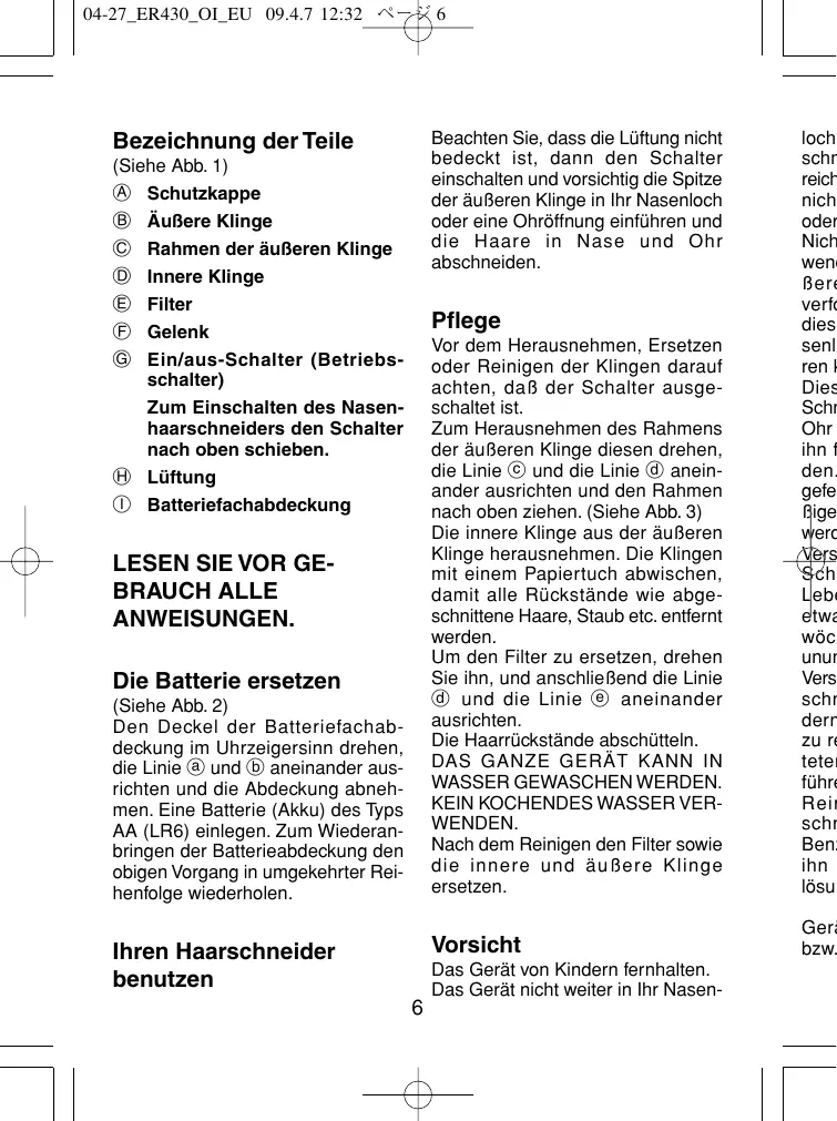 Dieser Haarschneider ist nur zum Schneiden von Haaren in Nase oder Ohr ausgelegt. Versuchen Sie nicht, ihn für andere Zwecke zu verwenden. Die Klingen sind prazisonsgefertigt. Sie dürfen keinem übermögen Druck, Stößen etc. ausgesetzt werden. Darauf achten, daß vor dem Versuch, die Klinge zu reinigen, der Schalter ausgeschaltet ist. Die Lebensdauer der Klingen beträgt etwa 3 Jahre, wenn diese einmal wochentlich jeweils 1 Minute lang ununterbrochen gebraucht werden. Versuchen Sie nicht, den Nasenhaarschneider eigenhändig zu verändern, auseinanderzunehmen oder zu reparieren, da dies zu unerwarteten Problemen und zu Unfälle führen kann.