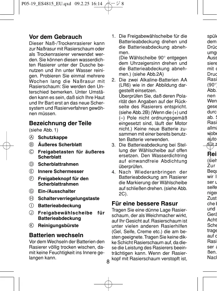 - Wenn der Rasierer längerere Zeit nicht benutzt wird, die Batterien Herausnahmen, damit sie nicht auslaufen können.
