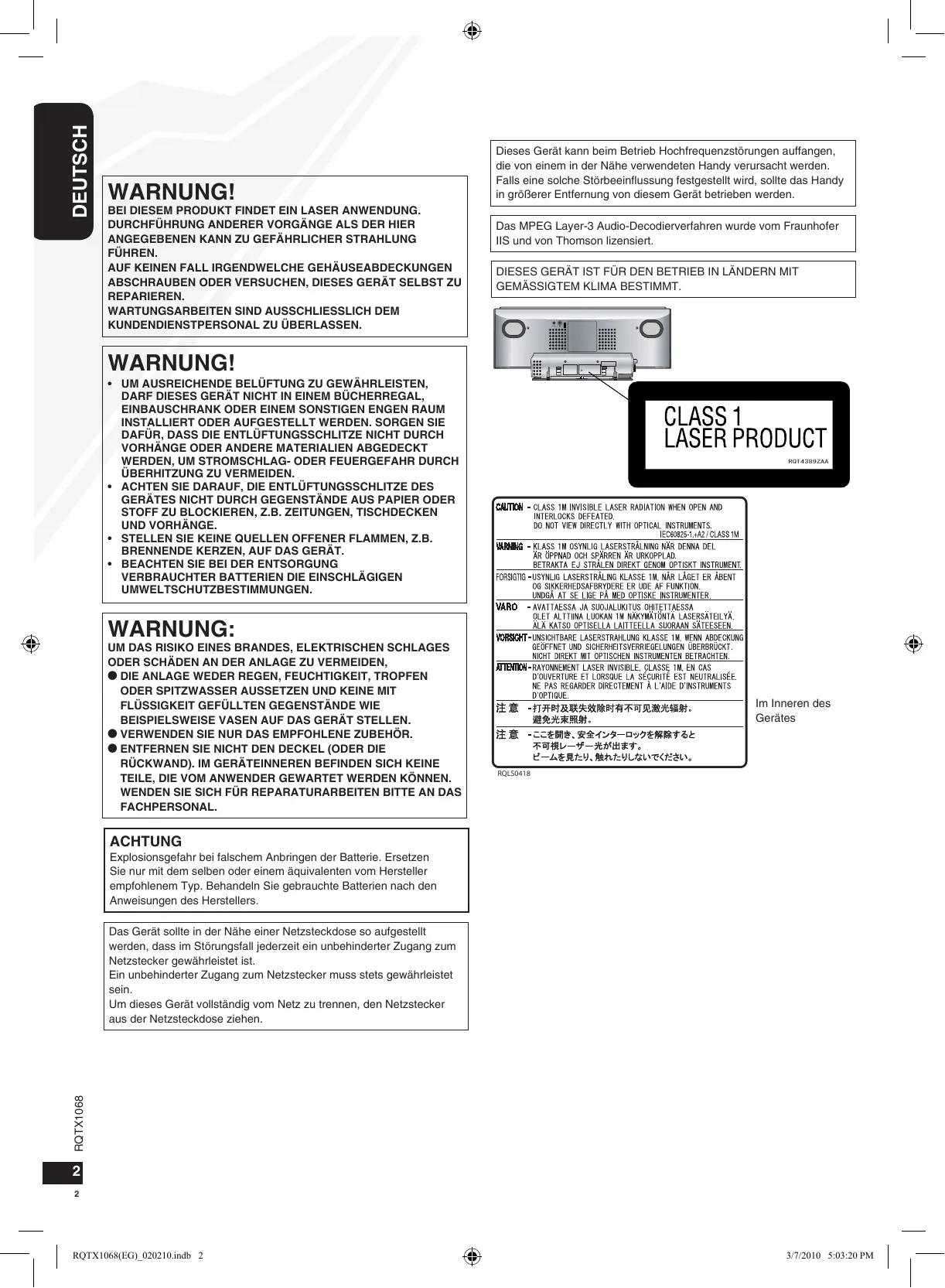 RQTX1068(EG)_020210.indb 2 3/7/2010 5:03:20 PM „Made for iPod“ bedeutet, dass ein elektronisches Gerät dafür entwickelt wurde, um insbesondere einen iPod anschließen zu können und dass es vom Entwickler zertifiziert wurde, um den Leistungsstandards von Apple zu entsprechen. „Works with iPhone“ bedeutet, dass ein elektronisches Gerät dafür entwickelt wurde, um insbesondere ein iPhone anschließen zu können und dass es vom Entwickler zertifiziert wurde, um den Leistungsstandards von Apple zu entsprechen. Apple ist für den Betrieb dieses Gerätes bzw. für die Konformität mit den Sicherheits- und regulatorischen Standards nicht verantwortlich. iPod ist ein Warenzeichen der Apple Inc., eingetragen in den U.S.A. und anderen Ländern. iPhone ist ein Warenzeichen der Apple Inc.