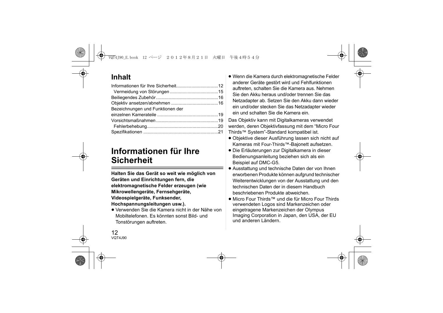 ≥ Wenn die Kamera durch elektromagnetische Felder anderer Geräte gestört wird und Fehlfunktionen auftreten, schalten Sie die Kamera aus. Nehmen Sie den Akku heraus und/oder trennen Sie das Netzadapter ab. Setzen Sie den Akku dann wieder ein und/oder stecken Sie das Netzadapter wieder ein und schalten Sie die Kamera ein. Das Objektiv kann mit Digitalkameras verwendet werden, deren Objektivfassung mit dem “Micro Four Thirds™ System”-Standard kompatibel ist. ≥ Objektive dieser Ausführung lassen sich nicht auf Kameras mit Four-Thirds™-Bajonett aufsetzen. ≥ Die Erläuterungen zur Digitalkamera in dieser Bedienungsanleitung beziehen sich als ein Beispiel auf DMC-G5. ≥ Ausstattung und technische Daten der von Ihnen erworbenen Produkte können aufgrund technischer Weiterentwicklungen von der Ausstattung und den technischen Daten der in diesem Handbuch beschriebenen Produkte abweichen. ≥ Micro Four Thirds™ und die für Micro Four Thirds verwendeten Logos sind Markenzeichen oder eingetragene Markenzeichen der Olympus Imaging Corporation in Japan, den USA, der EU und anderen Ländern. VQT4J90_E.book 13 ページ