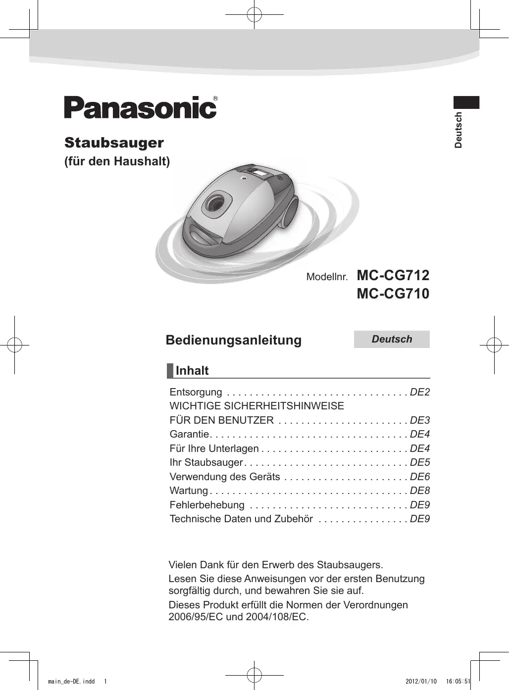 Laden Sie die Anleitung für Ihr Staubsauger kostenlos im PDF-Format! Finden Sie Ihr Handbuch MC-CG710 - PANASONIC und nehmen Sie Ihr elektronisches Gerät wieder in die Hand. Auf dieser Seite sind alle Dokumente veröffentlicht, die für die Verwendung Ihres Geräts notwendig sind. MC-CG710 von der Marke PANASONIC.
