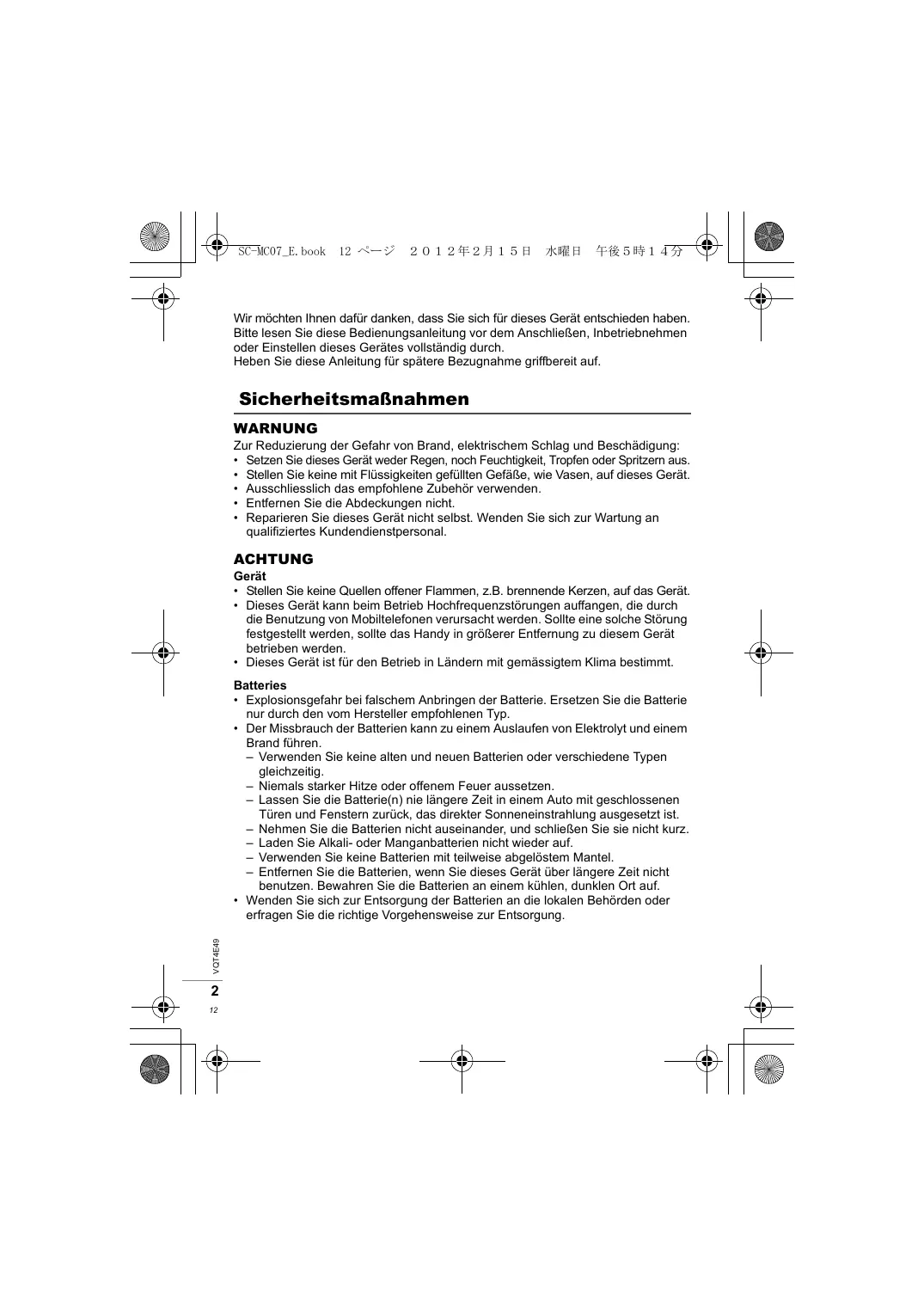 - USB hat höhere Priorität als eine Batterie, wenn dieses Gerät an einen PC angeschlossen ist, und die Batterie gleichzeitig eingesetzt wird. SC-MC07_E.book 15 ページ 2012年2月15日