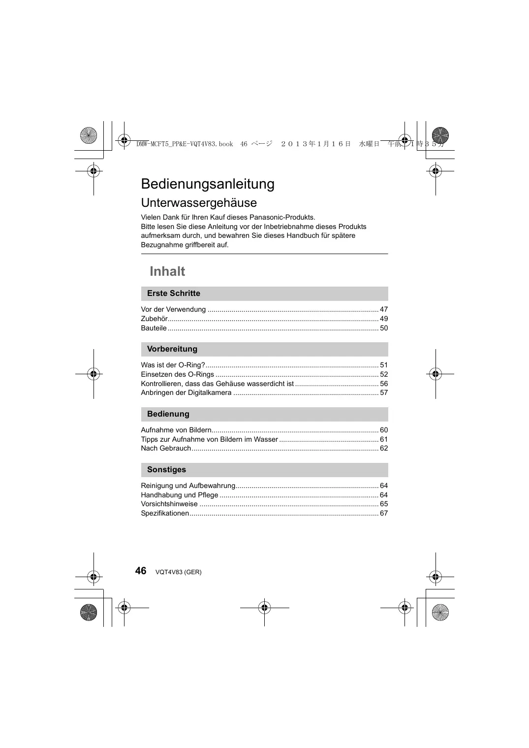 - Bedienungsanleitung Unterwassergehäuse Vielen Dank für Ihren Kauf dieses Panasonic-Produkts. Bitte lesen Sie diese Anleitung vor der Inbetriebnahme dieses Produkts aufmerksam durch, und bewahren Sie dieses Handbuch für spätere Bezugnahme griffbereit auf. Inhalt Erste Schritte Vor der Verwendung p. 47
