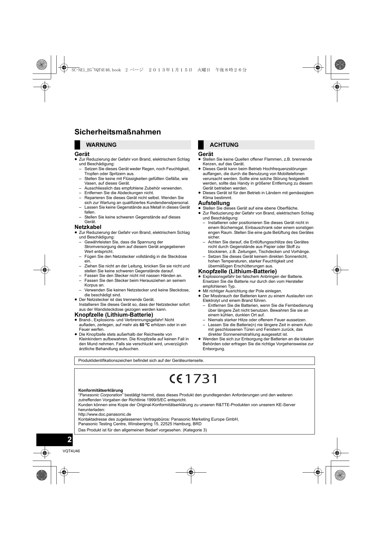 ≥ Setzen Sie die Knopfbatterie mit der (i)-Markierung nach oben zeigend ein. ≥ Bewahren Sie Knopfbatterien sicher vor Kindern auf, um die Gefahr des Verschluckens zu vermeiden. SC-NE1_EG~VQT4U46.book 5 ページ 2013年1月15日