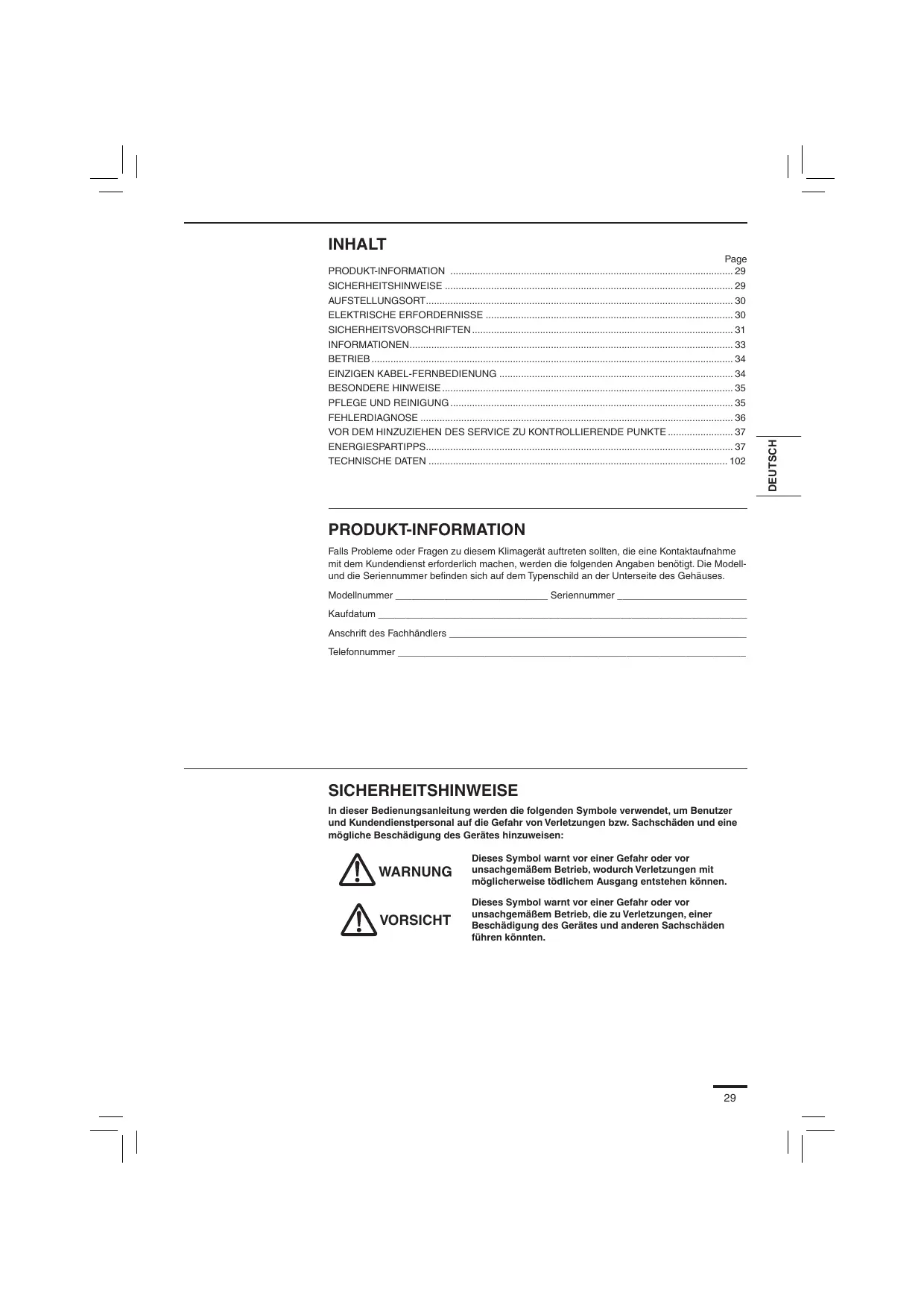 - SICHERHEITSHINWEISE p. 29