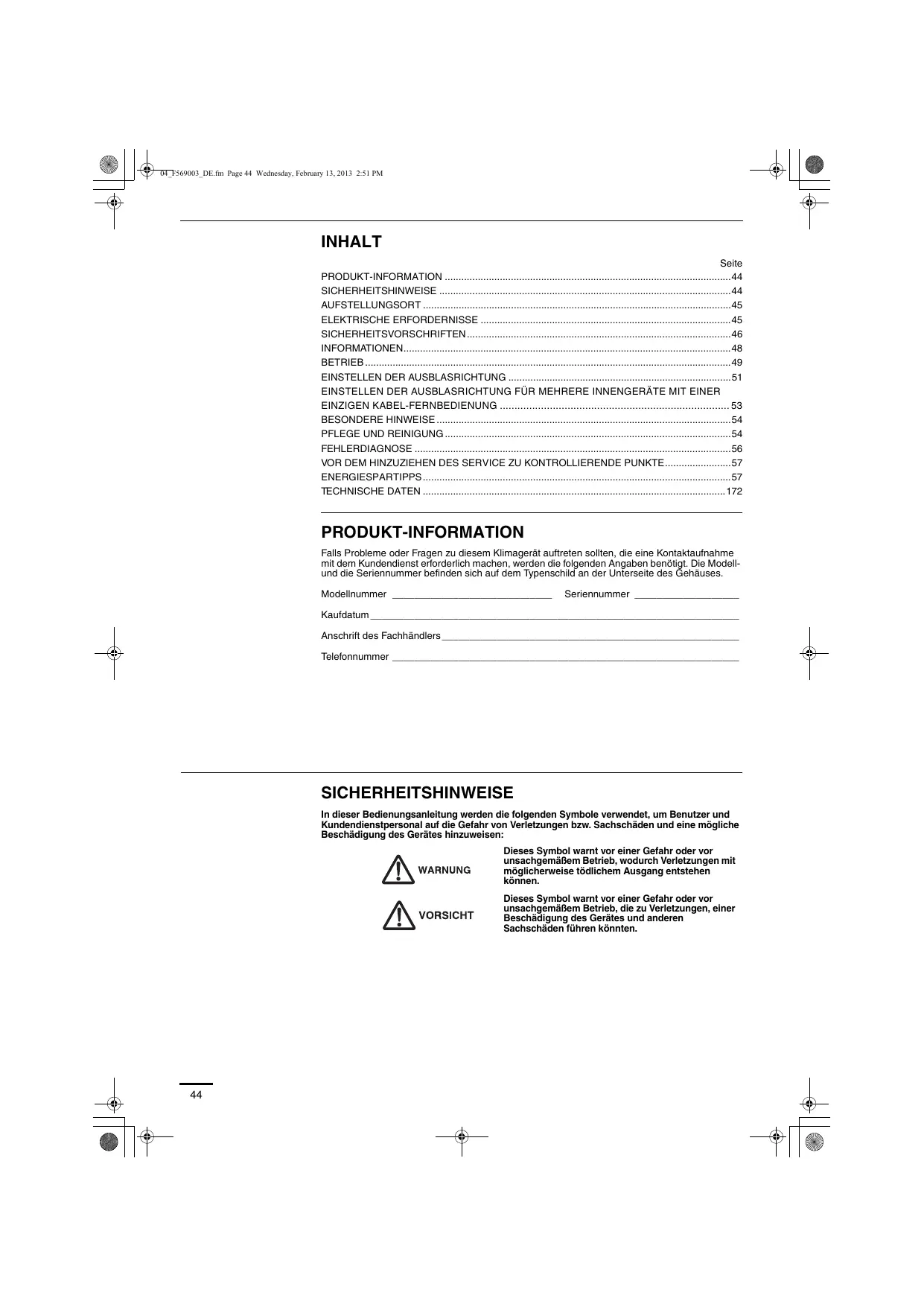 04_F569003_DE.fm Page 44 Wednesday, February 13, 2013 2:51 PM INHALT Seite PRODUKT-INFORMATION 44 SICHERHEITSHINWEISE 44 AUFSTELLUNGSORT 45 ELEKTRISCHE ERFORDERNISSE 45 SICHERHEITSVORSCHRIFTEN46 INFORMATIONEN48 BETRIEB 49 EINSTELLEN DER AUSBLASRICHTUNG 51 EINSTELLEN DER AUSBLASRICHTUNG FÜR MEHRERE INNENGERÄTE MIT EINER EINZIGEN KABEL-FERNBEDIENUNG 53 BESONDERE HINWEISE 54 PFLEGE UND REINIGUNG 54 FEHLERDIAGNOSE 56 VOR DEM HINZUZIEHEN DES SERVICE ZU KONTROLLIERENDE PUNKTE57 ENERGIESPARTIPPS 57 TECHNISCHE DATEN 172