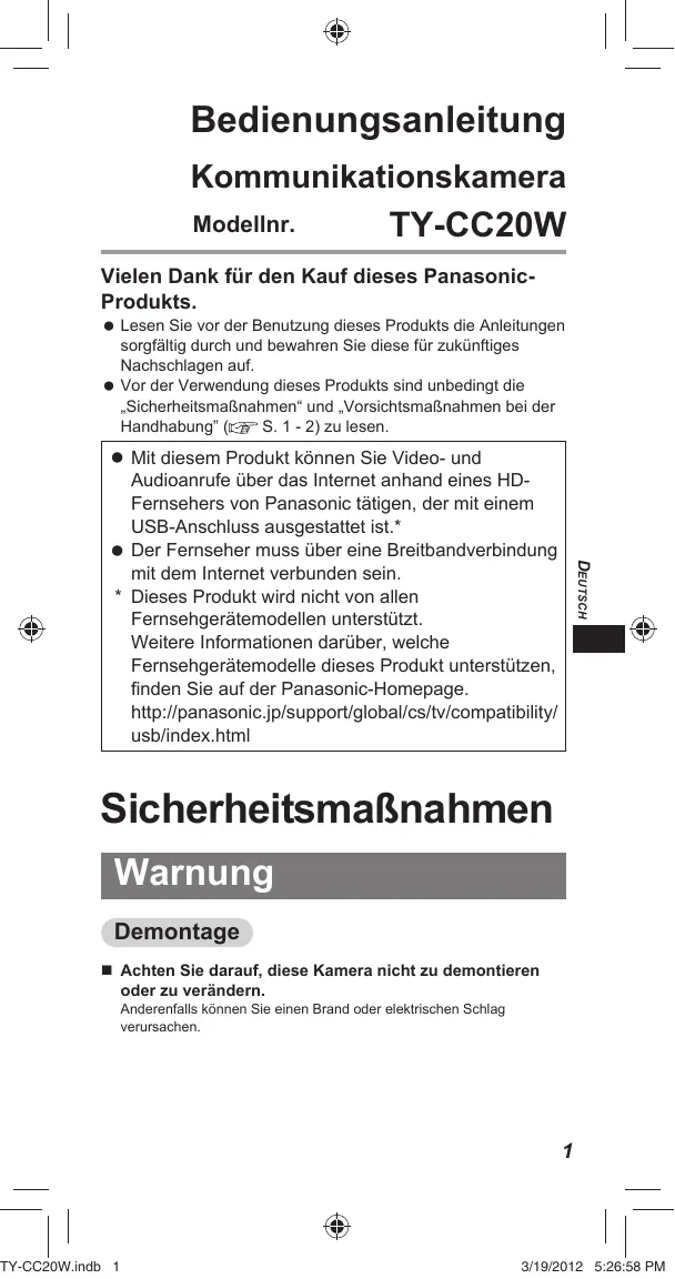 Finden Sie kostenlos die Bedienungsanleitung des Geräts TY-CC20W PANASONIC als PDF.