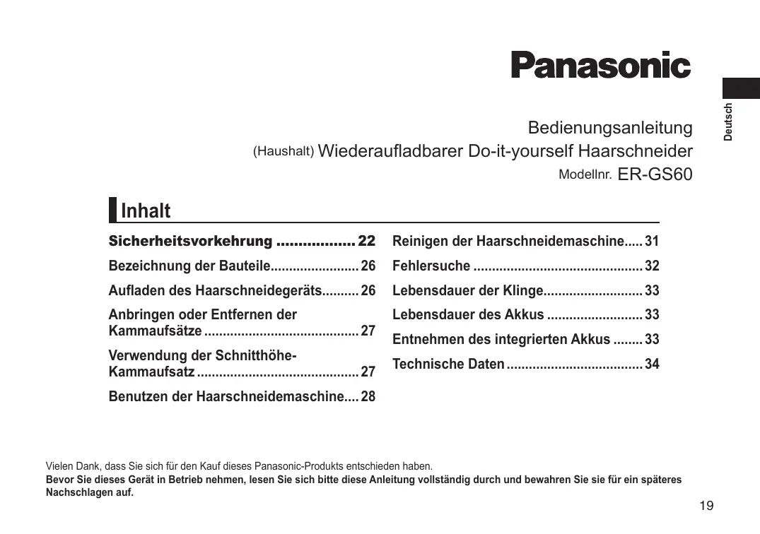 Bedienungsanleitung (Haushalt) Wiederaufladbarer Do-it-yourself Haarschneider Modellnr. ER‑GS60