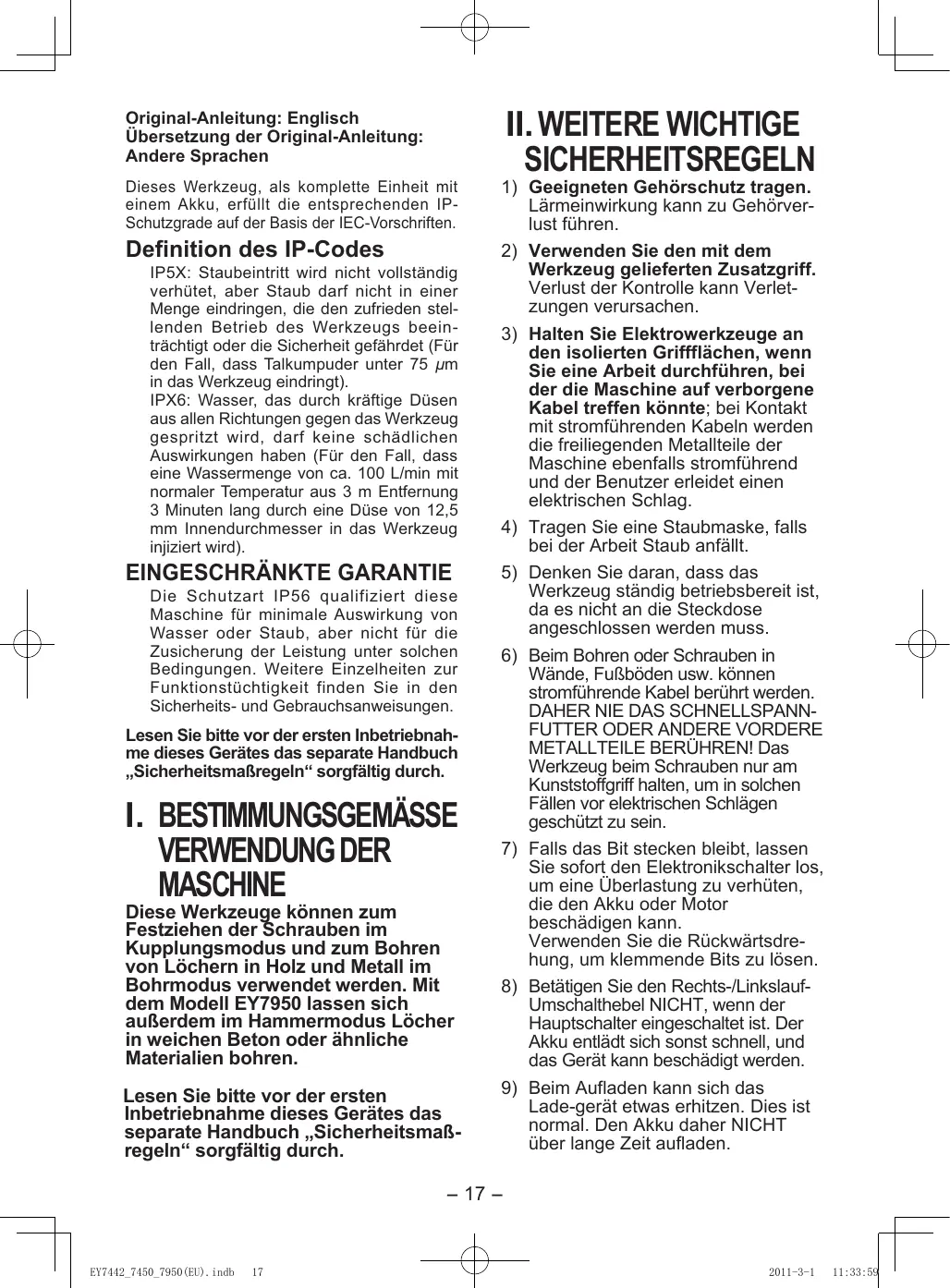 Original-Anleitung: Englisch Übersetzung der Original-Anleitung: Andere Sprachen Dieses Werkzeug, als komplette Einheit mit einem Akku, erfüllt die entsprechenden IPSchutzgrade auf der Basis der IEC-Vorschriften. Definition des IP-Codes IP5X: Staubeintritt wird nicht vollständig verhütet, aber Staub darf nicht in einer Menge eindringen, die den zufrieden stellenden Betrieb des Werkzeugs beeinträchtigt oder die Sicherheit gefährdet (Für den Fall, dass Talkumpuder unter 75 μm in das Werkzeug eindringt). IPX6: Wasser, das durch kräftige Düsen aus allen Richtungen gegen das Werkzeug gespritzt wird, darf keine schädlichen Auswirkungen haben (Für den Fall, dass eine Wassermenge von ca. 100 L/min mit normaler Temperatur aus 3 m Entfernung 3 Minuten lang durch eine Düse von 12,5 mm Innendurchmesser in das Werkzeug injiziert wird).