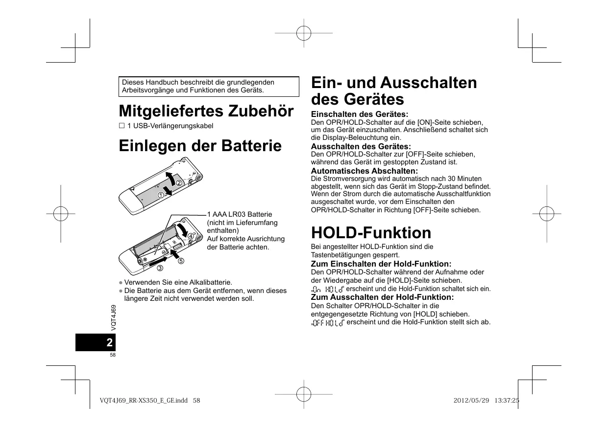 VQT4J69̲RR-XS350̲E̲En.indd 57 2012/05/25 11:48:08 Dieses Handbuch beschreibt die grundlegenden Arbeitsvorgänge und Funktionen des Geräts. Mitgeliefertes Zubehör 1 USB-Verlängerungskabel Einlegen der Batterie Ein- und Ausschalten des Gerätes Einschalten des Gerätes: Den OPR/HOLD-Schalter auf die [ON]-Seite schieben, um das Gerät einzuschalten. Anschließend schaltet sich die Display-Beleuchtung ein. Ausschalten des Gerätes: Den OPR/HOLD-Schalter zur [OFF]-Seite schieben, während das Gerät im gestoppten Zustand ist. Automatisches Abschalten: 1 AAA LR03 Batterie (nicht im Lieferumfang enthalten) Auf korrekte Ausrichtung der Batterie achten. Die Stromversorgung wird automatisch nach 30 Minuten abgestellt, wenn sich das Gerät im Stopp-Zustand befindet. Wenn der Strom durch die automatische Ausschaltfunktion ausgeschaltet wurde, vor dem Einschalten den OPR/HOLD-Schalter in Richtung [OFF]-Seite schieben. HOLD-Funktion Bei angestellter HOLD-Funktion sind die Tastenbetätigungen gesperrt. Zum Einschalten der Hold-Funktion: VQT4J69 ● Verwenden Sie eine Alkalibatterie. ● Die Batterie aus dem Gerät entfernen, wenn dieses längere Zeit nicht verwendet werden soll. Den OPR/HOLD-Schalter während der Aufnahme oder der Wiedergabe auf die [HOLD]-Seite schieben. “ erscheint und die Hold-Funktion schaltet sich ein. Zum Ausschalten der Hold-Funktion: Den Schalter OPR/HOLD-Schalter in die entgegengesetzte Richtung von [HOLD] schieben. “ erscheint und die Hold-Funktion stellt sich ab.