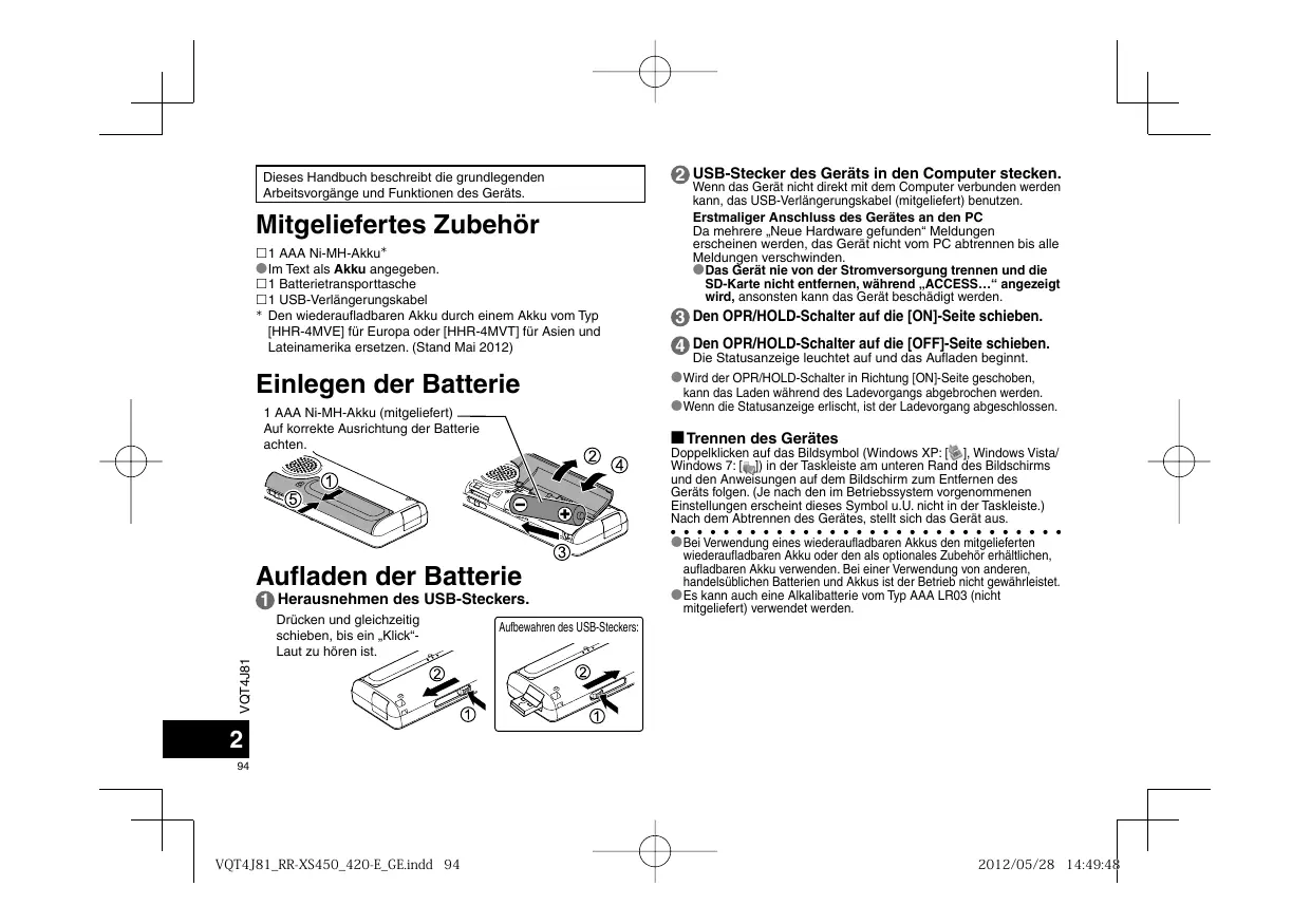2012/05/29 9:35:50 Dieses Handbuch beschreibt die grundlegenden Arbeitsvorgänge und Funktionen des Geräts. Mitgeliefertes Zubehör 1 AAA Ni-MH-Akku *Im Text als Akku angegeben. 1 Batterietransporttasche 1 USB-Verlängerungskabel Den wiederaufladbaren Akku durch einem Akku vom Typ [HHR-4MVE] für Europa oder [HHR-4MVT] für Asien und Lateinamerika ersetzen. (Stand Mai 2012) Einlegen der Batterie 1 AAA Ni-MH-Akku (mitgeliefert) Auf korrekte Ausrichtung der Batterie achten. 3 Den OPR/HOLD-Schalter auf die [ON]-Seite schieben. 4 Den OPR/HOLD-Schalter auf die [OFF]-Seite schieben. Die Statusanzeige leuchtet auf und das Aufladen beginnt. *Wird der OPR/HOLD-Schalter in Richtung [ON]-Seite geschoben, kann das Laden während des Ladevorgangs abgebrochen werden. *Wenn die Statusanzeige erlischt, ist der Ladevorgang abgeschlossen. Doppelklicken auf das Bildsymbol (Windows XP: [ ], Windows Vista/ Windows 7: [ ]) in der Taskleiste am unteren Rand des Bildschirms und den Anweisungen auf dem Bildschirm zum Entfernen des Geräts folgen. (Je nach den im Betriebssystem vorgenommenen Einstellungen erscheint dieses Symbol u.U. nicht in der Taskleiste.) Nach dem Abtrennen des Gerätes, stellt sich das Gerät aus. 1 Herausnehmen des USB-Steckers. VQT4J81 Wenn das Gerät nicht direkt mit dem Computer verbunden werden kann, das USB-Verlängerungskabel (mitgeliefert) benutzen. Erstmaliger Anschluss des Gerätes an den PC Da mehrere „Neue Hardware gefunden“ Meldungen erscheinen werden, das Gerät nicht vom PC abtrennen bis alle Meldungen verschwinden. *Das Gerät nie von der Stromversorgung trennen und die SD-Karte nicht entfernen, während „ACCESS…“ angezeigt wird, ansonsten kann das Gerät beschädigt werden. g Trennen des Gerätes Aufladen der Batterie Drücken und gleichzeitig schieben, bis ein „Klick“Laut zu hören ist. 2 USB-Stecker des Geräts in den Computer stecken. *Bei Verwendung eines wiederaufladbaren Akkus den mitgelieferten wiederaufladbaren Akku oder den als optionales Zubehör erhältlichen, aufladbaren Akku verwenden. Bei einer Verwendung von anderen, handelsüblichen Batterien und Akkus ist der Betrieb nicht gewährleistet. *Es kann auch eine Alkalibatterie vom Typ AAA LR03 (nicht mitgeliefert) verwendet werden. Aufbewahren des USB-Steckers: