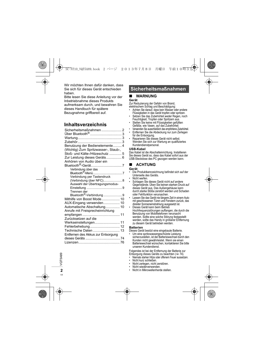 - Stand der in dieser Gebrauchsanweisung aufgeführten Produktnummern ist Juli 2013. Änderungen jederzeit möglich. VQT5A89 SC-NT10_VQT5A89.book 3 ページ