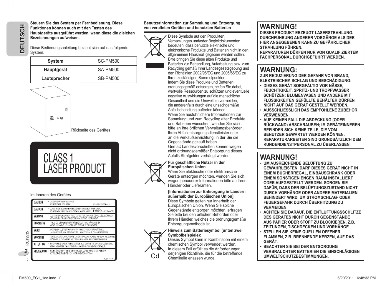 PM500_EG1_1de.indd 2 Benutzerinformation zur Sammlung und Entsorgung von veralteten Geräten und benutzten Batterien Diese Symbole auf den Produkten, Verpackungen und/oder Begleitdokumenten bedeuten, dass benutzte elektrische und elektronische Produkte und Batterien nicht in den allgemeinen Hausmüll gegeben werden sollen. Bitte bringen Sie diese alten Produkte und Batterien zur Behandlung, Aufarbeitung bzw. zum Recycling gemäß Ihrer Landesgesetzgebung und den Richtlinien 2002/96/EG und 2006/66/EG zu Ihren zuständigen Sammelpunkten. Indem Sie diese Produkte und Batterien ordnungsgemäß entsorgen, helfen Sie dabei, wertvolle Ressourcen zu schützen und eventuelle negative Auswirkungen auf die menschliche Gesundheit und die Umwelt zu vermeiden, die anderenfalls durch eine unsachgemäße Abfallbehandlung auftreten können. Wenn Sie ausführlichere Informationen zur Sammlung und zum Recycling alter Produkte und Batterien wünschen, wenden Sie sich bitte an Ihre örtlichen Verwaltungsbehörden, Ihren Abfallentsorgungsdienstleister oder an die Verkaufseinrichtung, in der Sie die Gegenstände gekauft haben. Gemäß Landesvorschriften können wegen nicht ordnungsgemäßer Entsorgung dieses Abfalls Strafgelder verhängt werden. Für geschäftliche Nutzer in der Europäischen Union Wenn Sie elektrische oder elektronische Geräte entsorgen möchten, wenden Sie sich wegen genauerer Informationen bitte an Ihren Händler oder Lieferanten. [Informationen zur Entsorgung in Ländern außerhalb der Europäischen Union] Diese Symbole gelten nur innerhalb der Europäischen Union. Wenn Sie solche Gegenstände entsorgen möchten, erfragen Sie bitte bei den örtlichen Behörden oder Ihrem Händler, welches die ordnungsgemäße Entsorgungsmethode ist. Hinweis zum Batteriesymbol (unten zwei Symbolbeispiele): Dieses Symbol kann in Kombination mit einem chemischen Symbol verwendet werden. In diesem Fall erfüllt es die Anforderungen derjenigen Richtlinie, die für die betreffende Chemikalie erlassen wurde. WARNUNG! DIESES PRODUKT ERZEUGT LASERSTRAHLUNG. DURCHFÜHRUNG ANDERER VORGÄNGE ALS DER