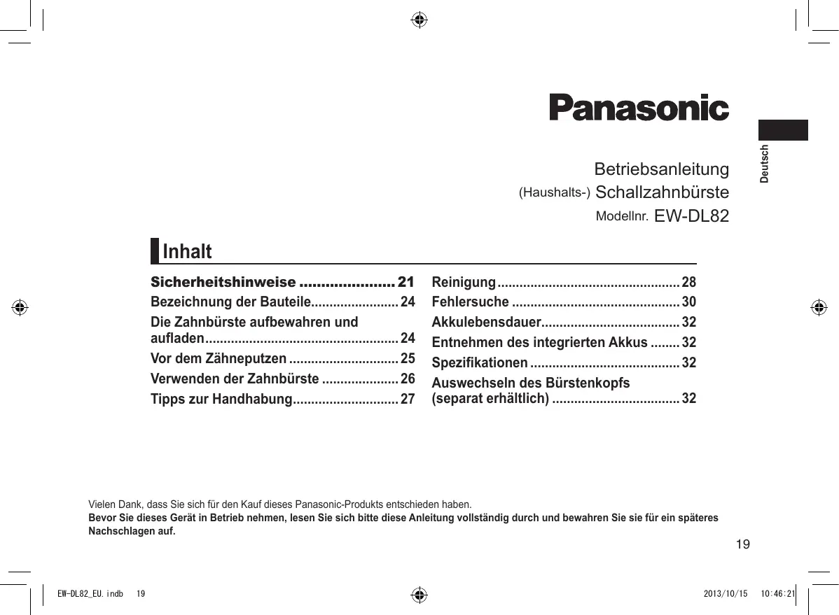 - Auswechseln des Bürstenkopfs (separat erhältlich) Vielen Dank, dass Sie sich für den Kauf dieses Panasonic-Produkts entschieden haben. Bevor Sie dieses Gerät in Betrieb nehmen, lesen Sie sich bitte diese Anleitung vollständig durch und bewahren Sie sie für ein späteres Nachschlagen auf. EW-DL82_EU.indb p. 32
