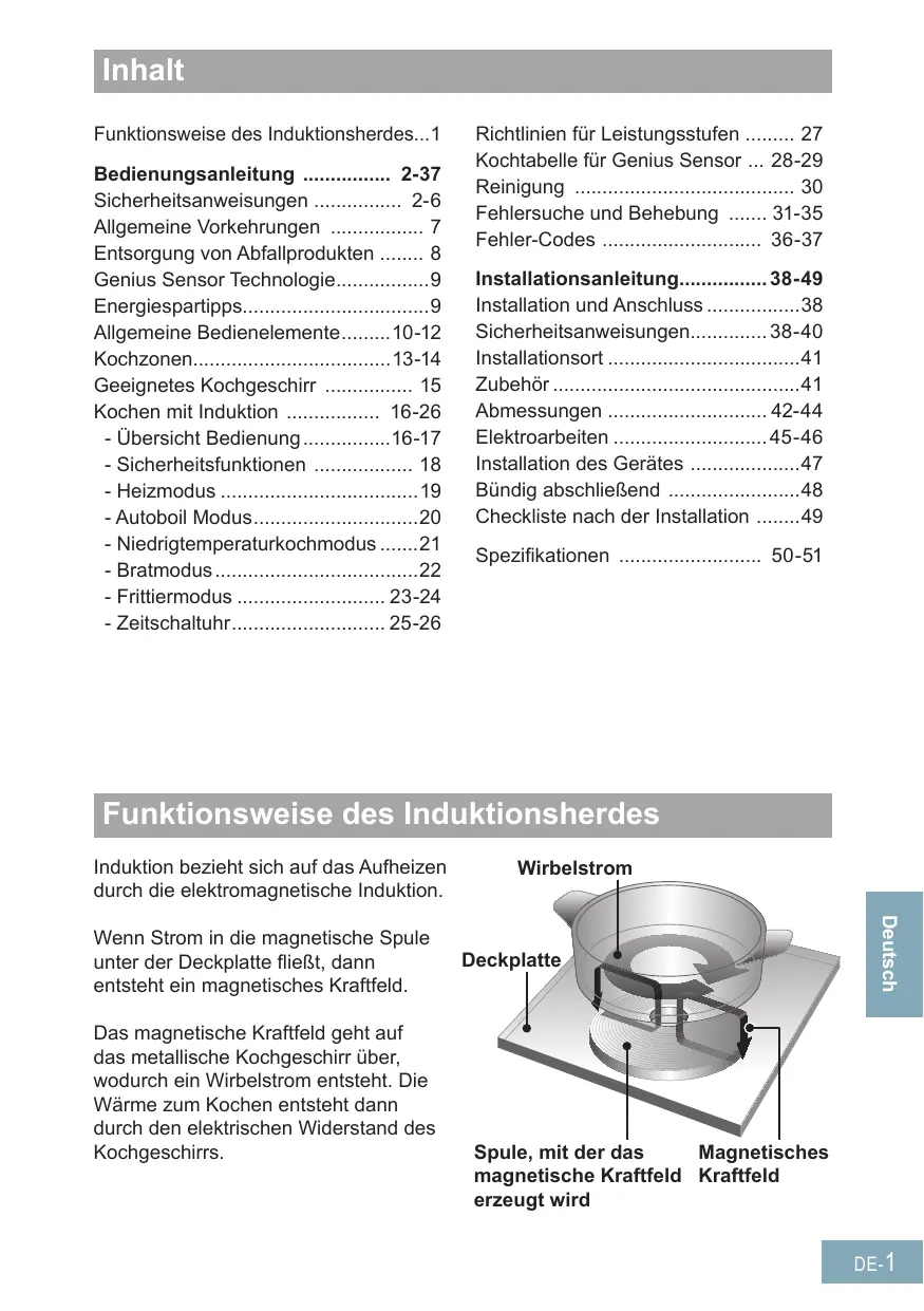 - Spezifikationen -51 Funktionsweise des Induktionsherdes Induktion bezieht sich auf das Aufheizen durch die elektromagnetische Induktion. Das magnetische Kraftfeld geht auf das metallische Kochgeschirr über, wodurch ein Wirbelstrom entsteht. Die Wärme zum Kochen entsteht dann durch den elektrischen Widerstand des Kochgeschirrs. Deckplatte Deutsch Wenn Strom in die magnetische Spule unter der Deckplatte fließt, dann entsteht ein magnetisches Kraftfeld. Wirbelstrom Spule, mit der das Magnetisches magnetische Kraftfeld Kraftfeld erzeugt wird DE- 1 Bedienungsanleitung Sicherheitsanweisungen ■■ Dieses Gerät kann von Kindern ab 8 Jahren und Personen mit eingeschränkten körperlichen, sensorischen oder geistigen Fähigkeiten oder mangelnder Erfahrung und Kenntnis verwendet werden, wenn sie beaufsichtigt werden oder Anleitung für die sichere Verwendung des Gerätes erhalten haben und die diesbezüglichen Risiken verstehen. Kinder sollten mit dem Gerät nicht spielen. Reinigung und Wartung sollte nicht von Kindern durchgeführt werden, die dabei ohne Aufsicht sind. ■■ Brennbare Materialien dürfen nicht in der Nähe des Gerätes gelagert werden. Dies kann zu einem Brand führen. ■■ Überhitzen Sie die Pfanne beim Vorheizen vor dem Braten nicht. ■■ WARNUNG: Im Falle einer Fehlfunktion oder eines Ausfalls müssen Sie die Verwendung des Gerätes sofort einstellen. Schalten Sie den Hauptschalter und den Schutzschalter aus und wenden sich an das Kundendienstzentrum. Wenn Sie dies nicht tun, kann dies zu Rauch, Verbrennungen und einem Stromschlag führen. DE- 2 Sicherheitsanweisungen ■■ Wenn das Stromkabel beschädigt ist, muss es von einem Kundendienstmonteur ersetzt werden, der vom Hersteller zugelassen ist, um Risiken zu vermeiden. ■■ Flüssigkeiten müssen vor dem Aufwärmen umgerührt werden. Sonst können Flüssigkeiten spritzen und zu Verbrennungen oder Verletzungen führen. ■■ Üben Sie keinen übermäßigen Druck auf die Deckplatte aus und lassen sie keine Gegenstände darauf fallen. Dies kann zu Rissen oder Schäden an der Deckplatte führen. ■■ Stellen Sie keine tragbaren Gasbrenner, Stahlzylinder und Dosenprodukte auf oder in die Nähe des Gerätes. Wenn sich diese erhitzen, können Sie explodieren. ■■ Schalten Sie das Kochfeld nach dem Gebrauch über das Bedienelement aus und verlassen Sie sich nicht auf die Pfannenerkennung. ■■ Sie sollten das Gerät nicht demontieren, reparieren oder modifizieren. Wenden Sie sich bezüglich Reparaturen an den Händler, bei dem Sie das Gerät gekauft haben. Deutsch ■■ Metallische Gegenstände wie Messer, Gabeln, Löffel und Deckel sollten nicht auf das Kochfeld gelegt werden, da sich diese erhitzen können. DE- 3 Sicherheitsanweisungen ■■ WARNUNG: Dieses Gerät muss geerdet werden, um Stromschlag oder einen Brand zu vermeiden. ■■ WARNUNG: Das Gerät und die zugänglichen Teile können bei Betrieb heiß werden. Deshalb gilt besondere Vorsicht, um das Berühren der Heizelemente zu vermeiden. Kinder unter 8 Jahren sollen vom Gerät fern gehalten werden, wenn sie nicht unter ständiger Aufsicht stehen. ■■ WARNUNG: Wenn Sie beim Kochen auf einem Kochfeld mit Fett oder Öl arbeiten und nicht dabei bleiben, so kann dies gefährlich werden und zu einem Brand führen. Versuchen Sie NIEMALS einen Brand mit Wasser zu löschen, sondern schalten Sie das Gerät ab und decken Sie dann die Flamme mit einem Deckel oder einer Feuerlöschdecke ab. ■■ WARNUNG: Brandgefahr: Lagern Sie keine Gegenstände auf der Kochfläche. ■■ WARNUNG: Wenn die Oberfläche einen Riss hat, schalten Sie das Gerät aus, um die Gefahr eines Stromschlags zu vermeiden. ■■ WARNUNG: Herdschutzgitter sind nicht für den Gebrauch mit diesem Gerät gedacht und sollten unter keinen Umständen angebracht werden. DE- 4 Sicherheitsanweisungen ■■ Wenn das Öl raucht, sofort Hauptschalter ausschalten. Ansonsten besteht Brandgefahr. ■■ Gehen Sie vorsichtig mit heißem Öl um, da es zu Verbrennungen führen kann. ■■ Seien Sie vorsichtig, wenn Sie die Pfanne mit einer kleinen Menge Öl vorheizen. Die Pfanne kann sich überhitzen und zu Schäden führen. ■■ Heizen Sie kein leeres Kochgeschirr auf und überhitzen Sie keine Zutaten. Die Zutaten können Feuer fangen und das Kochgeschirr beschädigen. ■■ Verwenden Sie das Gerät nicht zu anderen Zwecken als zum Kochen. Dies kann zu einer Überhitzung oder Fehlfunktion und zu einem Brand führen. Deutsch ■■ Wenn Sie ein medizintechnisches Gerät (z.B. einen Herzschrittmacher) tragen, dann wenden Sie sich an Ihren Arzt. Der Betrieb des Gerätes kann sich auf das medizintechnische Gerät auswirken. ■■ Verwenden Sie keinen Dampfreiniger. Dabei könnte Wasser in die elektrischen Bauteile eindringen und zu Schäden führen. DE- 5 Sicherheitsanweisungen ■■ Das Gerät ist nicht für den Betrieb mittels einer externen Zeitschaltuhr oder eines getrennten Fernbedienungssystems ausgelegt. ■■ Legen Sie kein Papier oder Geschirrtuch unter das Kochgeschirr. Dies könnte aufgrund der Hitze des Kochgeschirrs versengt werden. ■■ WARNUNG: Der Hersteller haftet nicht für Schäden an Personen oder Sachen, die durch die Nichtbeachtung obiger Anweisungen verursacht worden sind, durch Eingriffe in Teile des Gerätes oder durch die Verwendung von Ersatzteilen, die keine Originalersatzteile sind. DE- 6 Allgemeine Vorkehrungen ■■ Diese Gerät erzeugt ein magnetisches Kraftfeld. Bringen Sie keine Dinge in die Nähe des Gerätes, die auf Magnetfelder reagieren. -- Radio- und Fernsehgeräte oder Hörgeräte können gestört werden. -- Karten mit Magnetstreifen, z.B. von Geschäften oder Banken, können gelöscht oder beschädigt werden. ■■ Verwenden Sie keine anderen Induktionskochgeräte wie Induktionsreiskocher oder tragbare Induktionskochplatten auf der Deckplatte. Die von diesen Geräten erzeugten elektromagnetischen Wellen können das Gerät beschädigen. ■■ Lagern 