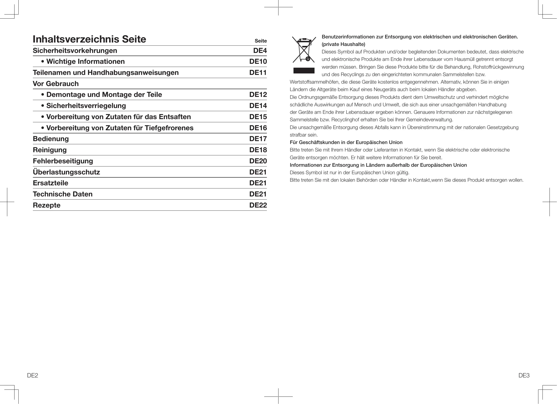 - Vorbereitung von Zutaten für Tiefgefrorenes DE16 Bedienung DE17 Reinigung DE18 Fehlerbeseitigung DE20 Überlastungsschutz DE21 Ersatzteile DE21 Technische Daten DE21 Rezepte DE22 DE2 Benutzerinformationen zur Entsorgung von elektrischen und elektronischen Geräten. (private Haushalte) Dieses Symbol auf Produkten und/oder begleitenden Dokumenten bedeutet, dass elektrische und elektronische Produkte am Ende ihrer Lebensdauer vom Hausmüll getrennt entsorgt werden müssen. Bringen Sie diese Produkte bitte für die Behandlung, Rohstoffrückgewinnung und des Recyclings zu den eingerichteten kommunalen Sammelstellen bzw. Wertstoffsammelhöfen, die diese Geräte kostenlos entgegennehmen. Alternativ, können Sie in einigen Ländern die Altgeräte beim Kauf eines Neugeräts auch beim lokalen Händler abgeben. Die Ordnungsgemäße Entsorgung dieses Produkts dient dem Umweltschutz und verhindert mögliche schädliche Auswirkungen auf Mensch und Umwelt, die sich aus einer unsachgemäßen Handhabung der Geräte am Ende ihrer Lebensdauer ergeben können. Genauere Informationen zur nächstgelegenen Sammelstelle bzw. Recyclinghof erhalten Sie bei Ihrer Gemeindeverwaltung. Die unsachgemäße Entsorgung dieses Abfalls kann in Übereinstimmung mit der nationalen Gesetzgebung strafbar sein. Für Geschäftskunden in der Europäischen Union Bitte treten Sie mit Ihrem Händler oder Lieferanten in Kontakt, wenn Sie elektrische oder elektronische Geräte entsorgen möchten. Er hält weitere Informationen für Sie bereit. Informationen zur Entsorgung in Ländern außerhalb der Europäischen Union Dieses Symbol ist nur in der Europäischen Union gültig. Bitte treten Sie mit den lokalen Behörden oder Händler in Kontakt,wenn Sie dieses Produkt entsorgen wollen. DE3 Sicherheitsmaßnahmen Befolgen Sie bitte die nachstehenden Anweisungen. Befolgen Sie bitte die nachstehenden Anweisungen, um Unfälle oder Verletzungen des Benutzers oder Dritter sowie Sachschäden zu vermeiden. ie nachfolgenden Hinweise zeigen das durch unsachgemäßen Gebrauch entstehende Schadensausmaß auf. WARNUNG: ACHTUNG: Weist auf die Möglichkeit schwerer Verletzungen oder Tod hin. Weist auf die Möglichkeit von Verletzungen oder Sachschäden hin. ■ Die Zeichen sind klassifiziert und wie folgt erläutert. Dieses Symbol weist auf ein Verbot hin. Dieses Symbol weist auf eine erforderliche Anweisung hin. WARNUNG: ●Vermeiden Sie Beschädigungen des Netzkabels oder des Netzsteckers. Folgende Aktionen sind streng untersagt. Verändern, Berühren oder Platzieren in unmittelbaren Nähe von Heizelementen, Verbiegen, Verdrehen, Ziehen, über scharfe Kanten ziehen, schwere Gegenstände darauf abstellen, Bündeln des Netzkabels und Tragen des Geräts am Netzkabel. (Dies kann zu Stromschlag oder Feuer durch Kurzschluss führen.) ●Verwenden Sie das Gerät nicht, wenn das Netzkabel oder der Netzstecker beschädigt ist oder der Netzstecker nur lose mit der Steckdose verbunden ist. (Dies kann zu Stromschlag oder Feuer durch Kurzschluss führen.) ➜ Sofern das Netzkabel beschädigt ist, muss es zur Vermeidung von Gefahren durch den Hersteller, dessen Kundendienst oder eine gleichermaßen qualifizierte Person ausgewechselt werden. DE4 WARNUNG: ● Den Netzstecker nicht mit nassen Händen einstecken oder abziehen. (Dies kann einen Stromschlag verursachen.)
