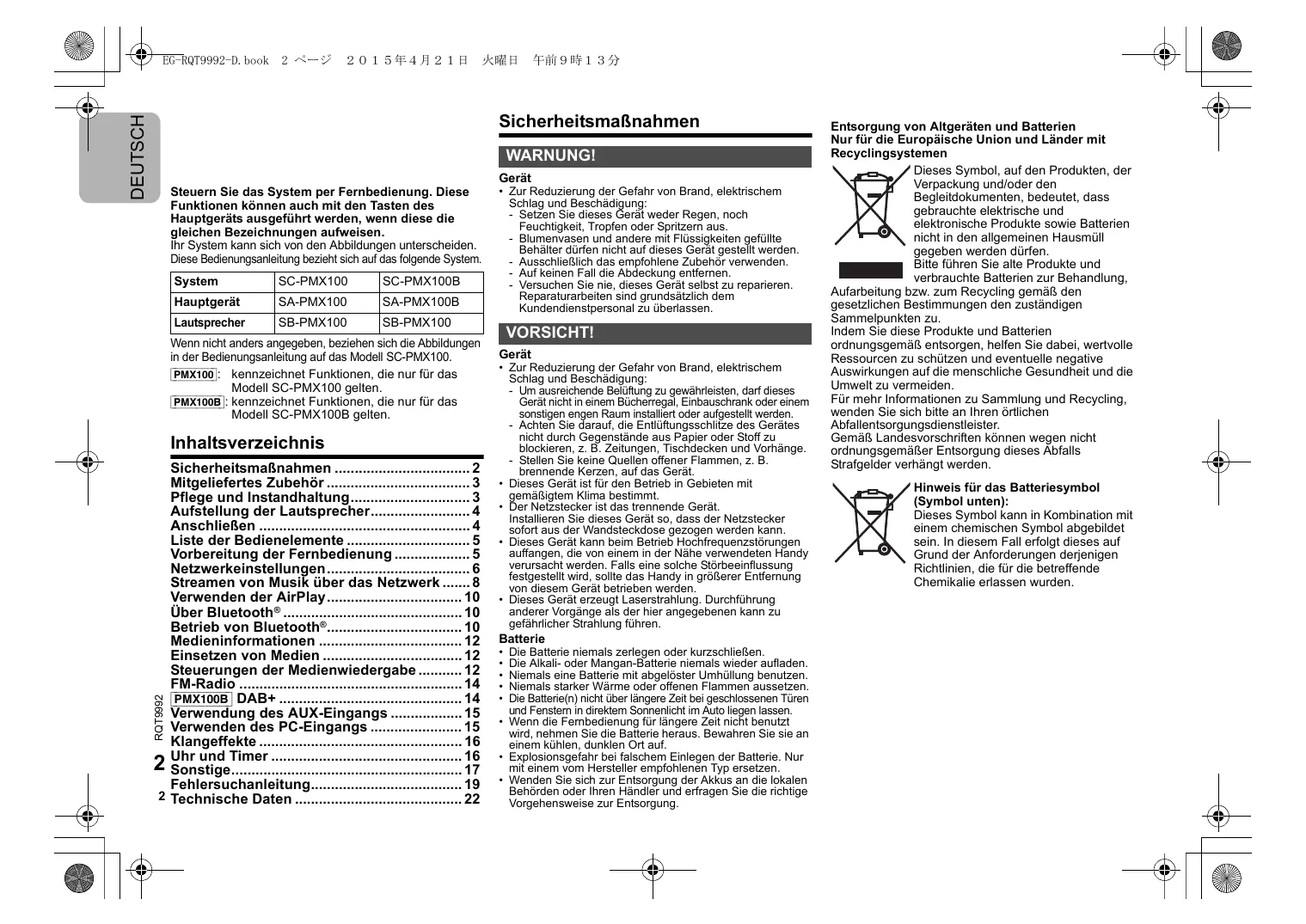 Finden Sie kostenlos die Bedienungsanleitung des Geräts SC-PMX100EG PANASONIC als PDF.