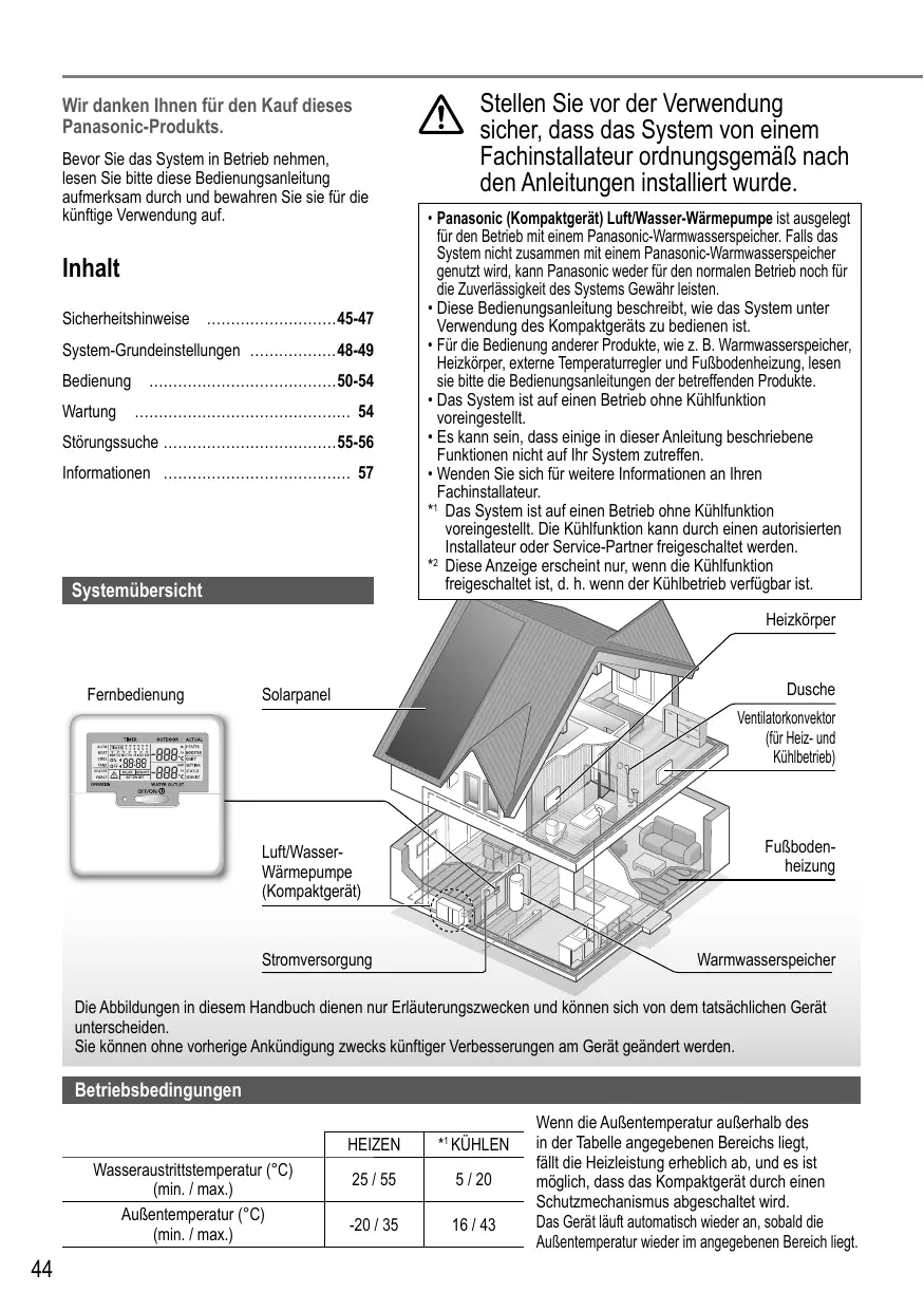 - Wenden Sie sich für weitere Informationen an Ihren Fachinstallateur. *1 Das System ist auf einen Betrieb ohne Kühlfunktion voreingestellt. Die Kühlfunktion kann durch einen autorisierten Installateur oder Service-Partner freigeschaltet werden. *2 Diese Anzeige erscheint nur, wenn die Kühlfunktion freigeschaltet ist, d. h. wenn der Kühlbetrieb verfügbar ist. Heizkörper Fernbedienung Dusche Solarpanel Ventilatorkonvektor (für Heiz- und Kühlbetrieb) Fußbodenheizung Luft/WasserWärmepumpe (Kompaktgerät) Warmwasserspeicher Stromversorgung Die Abbildungen in diesem Handbuch dienen nur Erläuterungszwecken und können sich von dem tatsächlichen Gerät unterscheiden. Sie können ohne vorherige Ankündigung zwecks künftiger Verbesserungen am Gerät geändert werden. Betriebsbedingungen Wasseraustrittstemperatur (°C) (min. / max.) Außentemperatur (°C) (min. / max.)