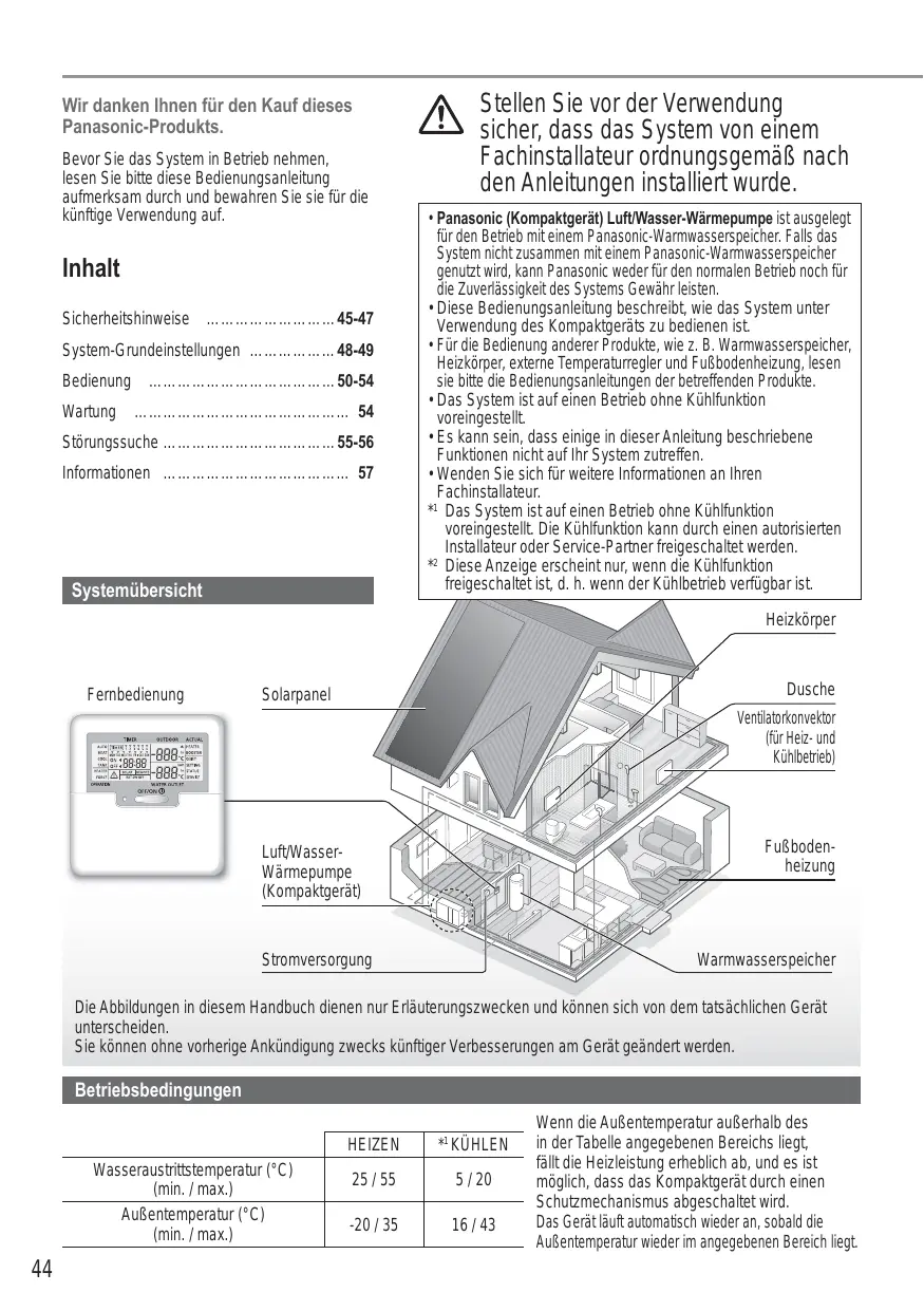 Stellen Sie vor der Verwendung sicher, dass das System von einem Fachinstallateur ordnungsgemäß nach den Anleitungen installiert wurde. • Panasonic (Kompaktgerät) Luft/Wasser-Wärmepumpe ist ausgelegt für den Betrieb mit einem Panasonic-Warmwasserspeicher. Falls das System nicht zusammen mit einem Panasonic-Warmwasserspeicher genutzt wird, kann Panasonic weder für den normalen Betrieb noch für die Zuverlässigkeit des Systems Gewähr leisten. • Diese Bedienungsanleitung beschreibt, wie das System unter Verwendung des Kompaktgeräts zu bedienen ist. • Für die Bedienung anderer Produkte, wie z. B. Warmwasserspeicher, Heizkörper, externe Temperaturregler und Fußbodenheizung, lesen sie bitte die Bedienungsanleitungen der betreffenden Produkte. • Das System ist auf einen Betrieb ohne Kühlfunktion voreingestellt. • Es kann sein, dass einige in dieser Anleitung beschriebene Funktionen nicht auf Ihr System zutreffen. • Wenden Sie sich für weitere Informationen an Ihren Fachinstallateur. *1 Das System ist auf einen Betrieb ohne Kühlfunktion voreingestellt. Die Kühlfunktion kann durch einen autorisierten Installateur oder Service-Partner freigeschaltet werden. *2 Diese Anzeige erscheint nur, wenn die Kühlfunktion freigeschaltet ist, d. h. wenn der Kühlbetrieb verfügbar ist. Heizkörper
