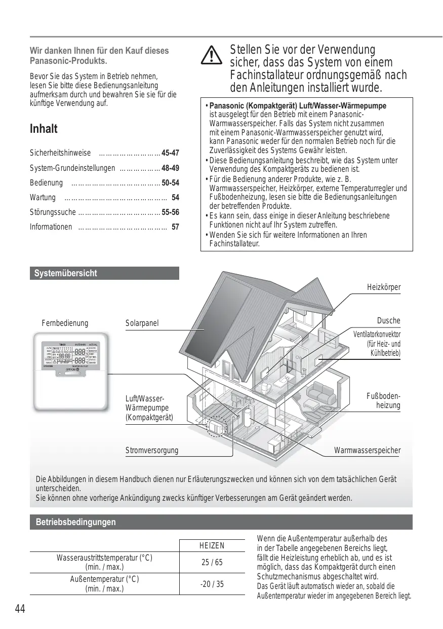 Stellen Sie vor der Verwendung sicher, dass das System von einem Fachinstallateur ordnungsgemäß nach den Anleitungen installiert wurde. Wir danken Ihnen für den Kauf dieses Panasonic-Produkts. Bevor Sie das System in Betrieb nehmen, lesen Sie bitte diese Bedienungsanleitung aufmerksam durch und bewahren Sie sie für die künftige Verwendung auf. Inhalt Sicherheitshinweise ………………………45-47 System-Grundeinstellungen ………………48-49 Bedienung …………………………………50-54 Wartung ……………………………………… 54 Störungssuche ………………………………55-56 Informationen ………………………………… 57