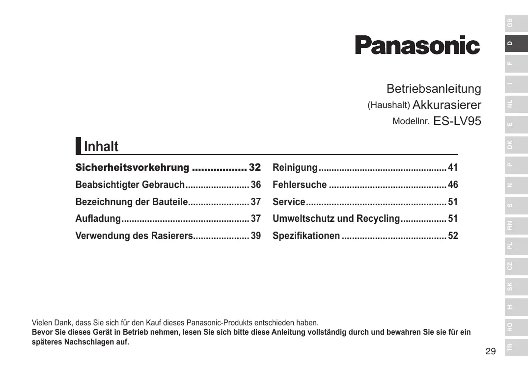 Laden Sie die Anleitung für Ihr Elektrischer Rasierer kostenlos im PDF-Format! Finden Sie Ihr Handbuch ES LV 95 - PANASONIC und nehmen Sie Ihr elektronisches Gerät wieder in die Hand. Auf dieser Seite sind alle Dokumente veröffentlicht, die für die Verwendung Ihres Geräts notwendig sind. ES LV 95 von der Marke PANASONIC.