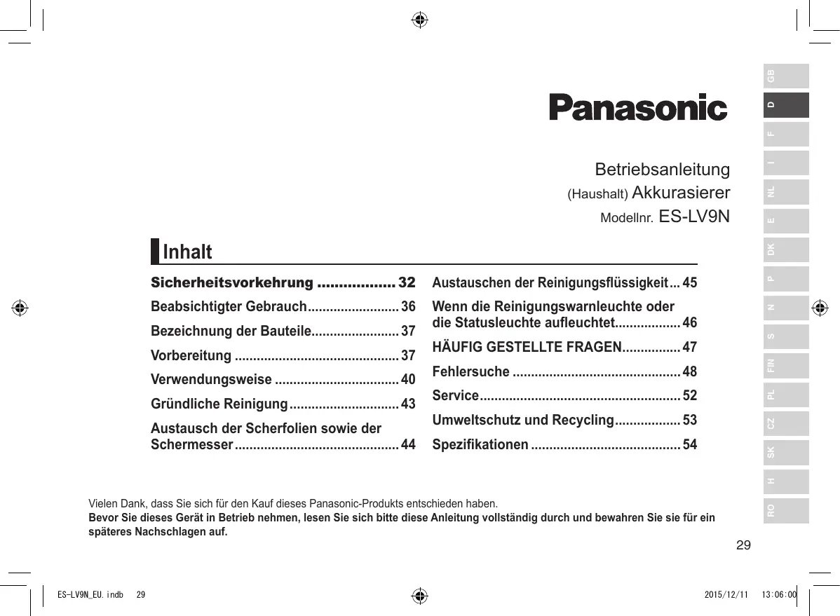 - Spezifikationen Vielen Dank, dass Sie sich für den Kauf dieses Panasonic-Produkts entschieden haben. Bevor Sie dieses Gerät in Betrieb nehmen, lesen Sie sich bitte diese Anleitung vollständig durch und bewahren Sie sie für ein späteres Nachschlagen auf. ES-LV9N_EU.indb p. 54