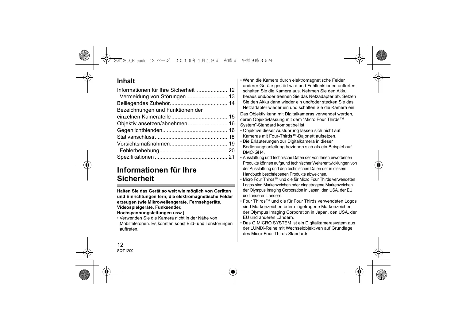 Inhalt Informationen für Ihre Sicherheit 12 Vermeidung von Störungen 13 Beiliegendes Zubehör 14 Bezeichnungen und Funktionen der einzelnen Kamerateile 15 Objektiv ansetzen/abnehmen 16 Gegenlichtblenden 16 Stativanschluss 18 Vorsichtsmaßnahmen 19 Fehlerbehebung 20 Spezifikationen 21