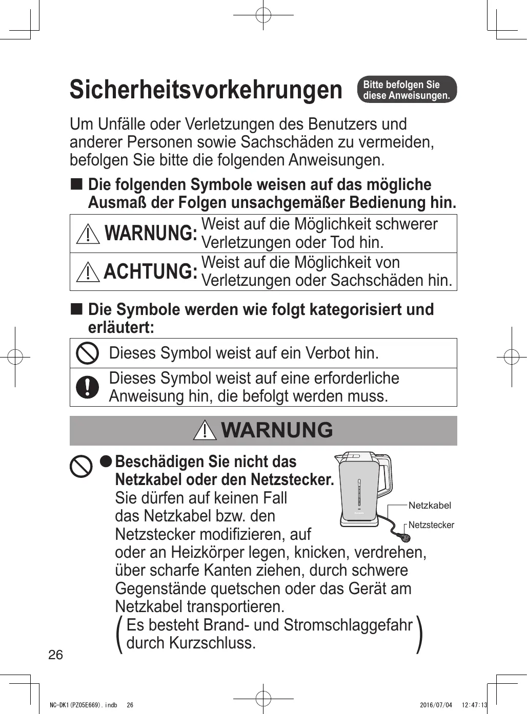 2016/07/04 12:47:14 Sicherheitsvorkehrungen Bitte befolgen Sie diese Anweisungen. ACHTUNG qqSchalten Sie das Gerät immer aus und ziehen Sie den Netzstecker aus der Steckdose, wenn Sie es nicht verwenden bzw. bevor Sie es bewegen oder reinigen. Andernfalls besteht Stromschlag- und Brandgefahr durch Kriechstrom. qqStellen Sie das Gerät auf eine feste, trockene, saubere, ebene und hitzebeständige Oberfläche. Andernfalls kann dies zu Brand oder Verletzung führen. qqGeben Sie während des Betriebs darauf Acht, nicht über das Netzkabel zu stolpern oder sich darin zu verfangen. Andernfalls kann dies zu Brand oder Verletzung führen. qqGeben Sie beim Öffnen des Deckels auf Dampf und heiße Wassertropfen Acht. (Es besteht Verbrennungsgefahr.) qqWenn die Deckeldichtung weiß geworden, zerkratzt oder gesprungen ist, ersetzen Sie sie. Andernfalls könnte beim Umkippen oder Neigen des Wasserkochers, heißes Wasser herausspritzen, was zu Verbrennungen führen kann. enden Sie sich für Ersatzteile bitte an den Händler, von dem Sie Ihren Wasserkocher gekauft haben oder an eine Panasonic-Servicezentrale.